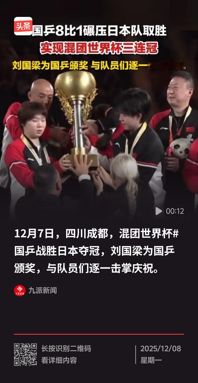 2025年成都混合团体世界杯决赛,国乒以8 - 1的大比分横扫日本队,实现赛事三连冠。颁奖典礼上,画面超燃。卸任后鲜少出席颁奖礼的刘国梁,这次因冠军奖杯“刘国梁索林杯”而现身。 颁奖时,刘国梁逐一与队员击掌,握手时眼含热泪,拥抱王楚钦还轻抚其脸颊,满是心疼与欣慰。孙颖莎主动站边缘,尽显团队精神。这奖杯重达10公斤,由王楚钦和蒯曼接过,去年是王曼昱和王楚钦捧杯,今年王曼昱受伤,蒯曼代表女队担此重任。国乒这场胜利实至名归,刘国梁一出现,国乒那熟悉又让人安心的氛围就回来了。