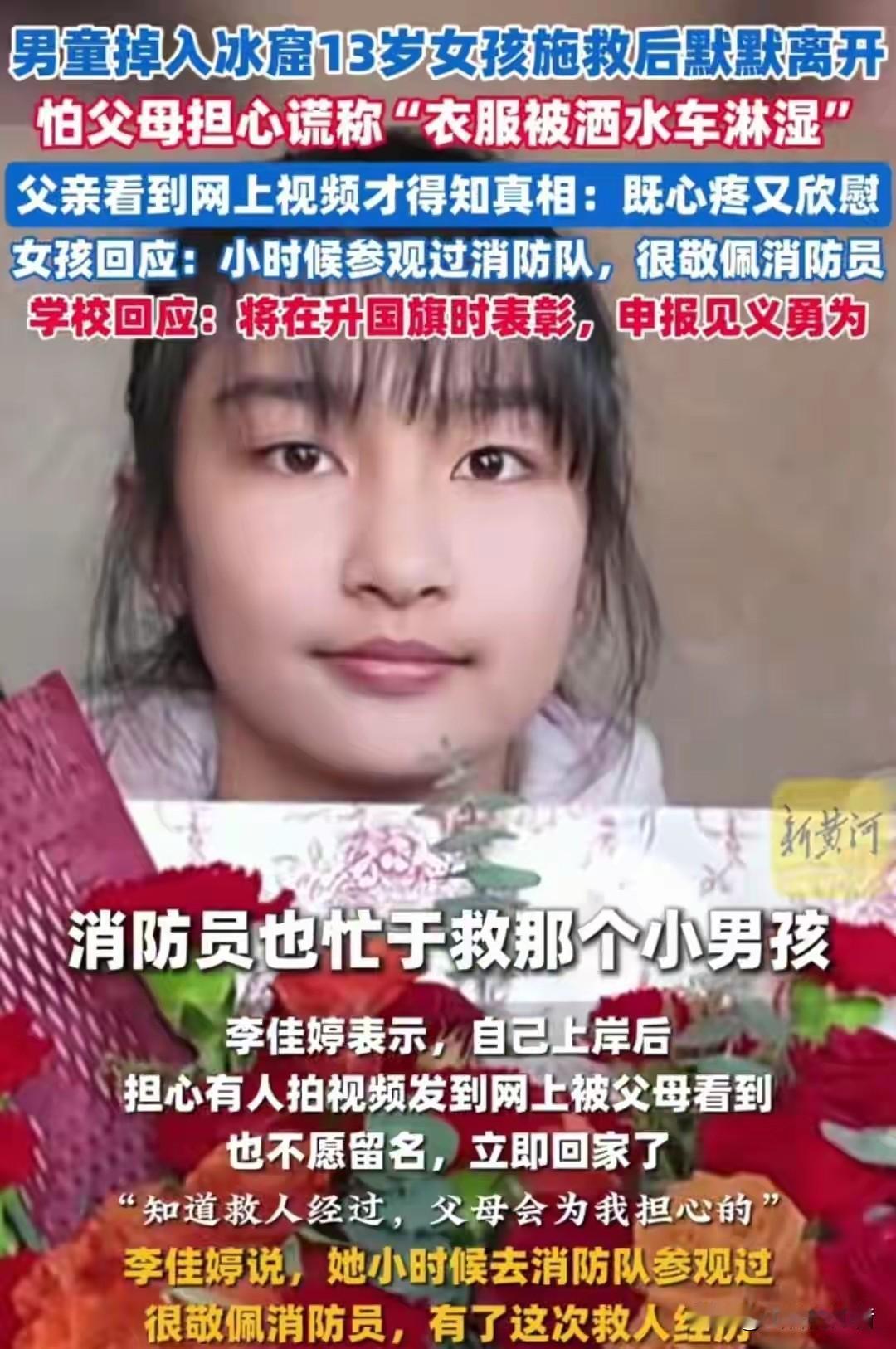 李佳婷救人后续:学校申报见义勇为、全校进行表彰 13岁救人小英雄李佳婷好样的,学校回应将在12月8日全校升国旗时对她的英勇无畏行为进行表彰,并为其申报见义勇为奖13岁还玩手机的年龄,可她却毫不犹豫的跳入冰窟窿救人,这得需要多大的勇气啊 12月6日傍晚,宁厦同心县的一个人工湖边,一4岁男孩在玩耍时,不慎掉入结冰的湖水中,当时的冰面很薄,男孩在冰冷的水中挣扎着,那幼小的身体一点点往下沉 薄冰被男孩的动作撞得咔咔作响,湖水泛着刺骨的寒意,光是看着都让人打哆嗦,周围瞬间围过来不少路人,却没人敢贸然上前——谁都清楚,这脆得像纸的冰面,稍微用力就可能连自己都陷进去。 13岁,可不是闹着玩的年纪,正是放学回家追动漫、跟同学分享零食的轻松时光,可李佳婷的第一反应不是害怕,而是主动往前站。别人还在慌乱呼救时,她已经盯上了身边的管子,一句“我身体轻,我来递”,利落得让人忘了她也只是个需要被照顾的孩子。 谁能想到,这个事后会撒谎怕家人担心的小姑娘,在冰窟面前竟如此勇敢。她攥着管子落水的那一刻,浑身都被冰水浸透,手脚冻得发僵,却死死不肯松手,心里就认准了要把那个小男孩拉上来,这份韧劲,太戳人了! 之前她默默离开、不肯留名,就知道她从来没把救人当成什么值得炫耀的事,只是本能地做了该做的。没有豪言壮语,没有刻意表现,这份不掺任何功利心的善良,比任何荣誉证书都更让人动容。 学校要在升国旗时给她表彰,还要申报见义勇为奖,这份安排太有心了!这不仅是对李佳婷个人的肯定,更是给全校师生上了最生动的一课。看着身边的同学成为小英雄,比课本里的大道理更有感染力,能让更多孩子明白,善良从来都不是口号。 总有人说现在的孩子娇生惯养,扛不起事,可李佳婷用行动狠狠打破了这种偏见。年龄大小从来不是勇气的标尺,心里装着温暖与正义,哪怕只是个半大的孩子,也能爆发出惊人的力量,这份勇气,连很多成年人都自愧不如。 升国旗时的表彰,对李佳婷来说,或许是一份意外的惊喜,更是一份沉甸甸的责任。相信站在国旗下的她,心里没有骄傲自满,只有对那个小男孩平安无事的庆幸,这份纯粹,正是最难得的品质。 她的故事之所以能打动这么多人,不光是因为她的勇敢,更因为她的真实。会害怕家人担心而撒谎,会在做好事后悄悄离开,这样的小英雄,不遥远、不刻意,就像我们身边的同学、邻居家的孩子,让人觉得善良和勇敢其实就在身边。 这份见义勇为的申报,不只是给李佳婷的荣誉,更是在向全社会传递一种力量:无论年纪大小,只要心怀善意、敢于担当,就是值得被尊重、被学习的榜样。也希望更多孩子能以她为标杆,在未来的日子里,守住心里的那份温暖。 13岁的李佳婷,用一次本能的善举,诠释了什么是真正的侠义。她的勇敢不是逞强,而是刻在骨子里的善良,这份善良,能融化寒冬的冰,也能照亮更多人的路。 各位读者你们怎么看?欢迎在评论区讨论。