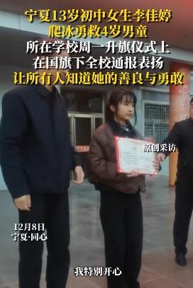 宁夏下冰窟救人的女孩正脸照曝光!小姑娘不仅长的眉清目秀的,说话也是井井有条。在回忆当时为什么默默的离开时,她很淡定的说:当时看到大家都在救人,不想再给大家添麻烦了,就走了。 2025年12月6日,当天下午3时许,4岁男童轩轩在豫海湖的冰面上玩耍。 然而午后气温回升让本就薄弱的冰层变得更加脆弱,一声“咔嚓”脆响,孩子瞬间坠入零下5摄氏度的冰窟中。 刺骨的湖水迅速漫过胸口,轩轩的哭声在寒风中撕心裂肺,岸边围拢的成年人急得团团转,却没人敢贸然上前。 因为根据消防部门的数据,冬季野外冰面事故中,60%的二次危险来自盲目施救,未经勘察的冰层厚度往往不足5厘米,极易造成连环塌陷。 可就在这15分钟的黄金救援时间里,骑着电动车放学路过的李佳婷停下了脚步。 阿姨,我身体轻,我下去救人!清脆的声音打破了现场的死寂,她没有丝毫犹豫,接过路人找来的塑料管子,立刻趴在冰面上匍匐前进。 这个下意识的动作,竟暗合了专业救援的核心原则,通过扩大受力面积减少冰面压强,避免二次坍塌。 小弟弟,抓牢了,别松手!她一边安抚着惊慌的轩轩,一边一点点靠近冰窟,寒风刮在脸上像小刀子,单薄的校服根本抵挡不住刺骨的寒意。 意外还是发生了。当李佳婷距离轩轩仅剩五六米时,身下的冰层突然破裂,她“扑通”一声坠入湖中,湖水瞬间漫到脖颈,冻得她牙齿打颤、浑身发抖。 可即便自己身陷险境,她的双手依然死死攥着那根救命的管子,从未松开,岸边的大人们见状立刻合力拉拽,先将李佳婷拖上岸。 几分钟后,消防救援队员火速赶到,利用专业工具破冰,成功将轩轩救出,下午3时40分,经医护人员检查,男童脱离生命危险,这场生死救援终于画上句号。 浑身湿透的李佳婷裹着路人递来的毯子,看着轩轩平安无事,悄悄擦干身上的水渍,骑上电动车默默离开了。 当天下午4点多回到家时,她的校服已经冻得发硬,头发还在滴水,面对父亲李晓辉略带责怪的询问,她平静地撒下了那个“洒水车”的谎言。 直到当晚11点,姑姑在社交平台刷到救人视频,打电话告知李晓辉,这位常年在外打工的父亲才知晓女儿白天的经历,心疼与骄傲瞬间交织,让他红了眼眶。 然而李佳婷的勇敢,从来不是一时冲动,父亲说,他和妻子长期在外务工,女儿跟着奶奶生活,从小就懂事得让人心疼。 不仅能把自己的学习和生活打理得井井有条,还主动帮奶奶照顾年幼的妹妹,洗衣、做饭、打扫卫生,样样都能上手。 在学校里,她是老师眼中的“热心肠”,同学闹矛盾时会主动调解,做好事从不张扬,很多善举都是同学悄悄告诉老师的。 而这份刻在骨子里的善良,还藏着对“救援”的懵懂认知,她小时候曾参观过消防队,敬佩那些逆行的英雄,没想到真的在危急时刻,用上了模糊记忆里的安全常识。 男童家长马先生在孩子脱险后,立刻发布寻人信息,一定要找到这个救命的小姑娘! 这条充满感激的信息迅速在网络传播,从“全城寻找”到“全网点赞”,李佳婷救人后默默离去的照片刷爆社交平台。 网友们纷纷留言,小小年纪有大爱,这才是新时代少年该有的样子,她的谎言里全是善良。 央广网、光明网等权威媒体陆续报道,同心县第二中学也决定为她申报见义勇为荣誉,在升国旗时进行表彰。 当马先生带着水果、宰好的羊羔肉和现金登门致谢时,李佳婷和家人坚决拒绝了现金,只收下了那份沉甸甸的心意。 救人不是为了钱,就是顺手帮个忙,面对恩人,这个腼腆的女孩说出了最朴实的心里话。 而在接受采访时,她也认真地说,以后再遇到这种情况,会先喊大人或者用电话手表报警,换一种更安全的方式帮忙。 这个13岁女孩的故事,像一面镜子,照见了人性的美好,也引发了全社会对“见义勇为”的深层思考。 李佳婷的父亲李晓辉在骄傲之余,也反复提醒女儿,以后再遇到这种事,一定要先保证自己安全,不能逞强。 这或许是事件留给我们最珍贵的启示,见义勇为的精神值得歌颂,但保护好自己,才能让善意有延续的可能。