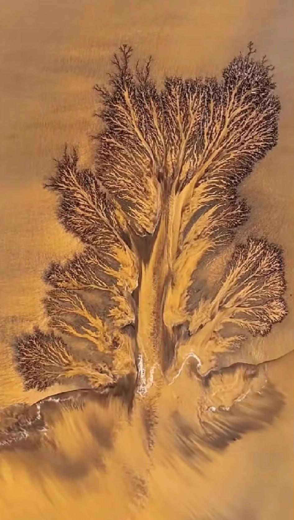 浙江网友无人机刚升空就惊到失语!钱塘江退潮后,滩涂上居然“长”出了棵参天大树,枝干纵横比画的还传神! 这哪是真树啊,是潮水用千万年光阴雕出来的宝贝!退潮时水流顺着低洼处冲刷,冲成的沟槽粗的是“树干”,细的是“枝丫”,深褐色滩涂当底色,沟里残水泛着光,活脱脱一幅大地水墨。 别以为它只靠颜值出圈,人家还是个迷你生态王国,小螃蟹、小贝壳在沟里安家,候鸟还来这儿觅食。更绝的是它超“傲娇”,每天只露二三十分钟,还得赶上初一到初五、十五到二十的大潮期,晴天泥沙稳才看得完整。 原来大自然从不会把美景摆到明面,那些藏在寻常场景里的奇观,都是给愿意抬头、肯等一等的人准备的。你见过哪些藏在角落的自然惊喜?来评论区分享下~钱塘江潮景 钱塘江风景 潮汐树航拍 钱塘江潮汐画 钱塘江潮潮景 钱塘江岸线 钱塘江潮树