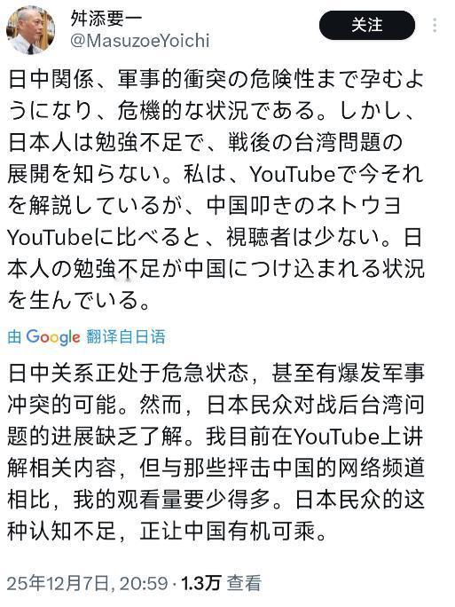 日本前东京都知事、国际政治学者舛添要一昨晚(12月7日晚)发文写道:“日中关系正处于危急状态,甚至有爆发军事冲突的可能。然而,日本民众对战后台湾问题的进展缺乏了解。我目前在YouTube上讲解相关内容,但与那些抨击中国的网络频道相比,我的观看量要少得多。日本民众的这种认知不足,正让中国有机可乘。” 舛(chuan)添忧心忡忡地表示,这种集体认知缺失,正在为中国的战略布局创造可乘之机。 更值得警惕的是,日本政坛近年来在台湾问题上频频踩线。从安倍晋三的"台湾有事就是日本有事",到岸田文雄政府的"防卫预算翻倍"计划,日本正在逐步偏离和平宪法的轨道。 这些危险举动背后,是日本民众对台海风险的无知或漠视。舛添指出,当大多数日本人还沉浸在"和平宪法"的安全幻觉中时,政客们已经悄悄把国家推向战争边缘。 中国方面敏锐地捕捉到了日本的这种认知漏洞。近年来,中国通过多种渠道向日本传递信息,一方面强调台湾问题的红线不容触碰,另一方面又刻意展示军事实力。 这种"胡萝卜加大棒"的策略,在日本民众认知不足的背景下显得格外有效。舛添观察到,中国正在利用日本的信息不对称,逐步压缩日本在台海问题上的操作空间。 日本媒体在这场认知战中扮演了极不光彩的角色。主流媒体要么回避敏感话题,要么跟着美国鹦鹉学舌,很少提供客观全面的分析。而网络空间更是被极端言论占据,理性声音被淹没在口水战中。 舛添的遭遇就是明证——一个试图讲真话的学者,竟然敌不过那些哗众取宠的网红。这种媒体生态,让日本民众越来越难以获得真实信息。 教育领域的缺失同样令人担忧。日本的历史教科书对殖民统治和战争罪行的轻描淡写,直接导致了年轻一代对台湾问题的认知空白。当中国学生都能背诵"台湾是中国不可分割的一部分"时,日本学生却连《开罗宣言》的基本内容都不了解。这种教育差距,正在转化为国家认知的鸿沟。 经济因素也在暗中影响着日本民众的判断。作为世界第三大经济体,日本对华贸易额占比高达20%以上。这种经济依赖让许多日本人产生了"和平幻想",认为中国不会为了台湾问题破坏经济合作。舛添警告说,这种想法极其危险,完全低估了中国在台湾问题上的决心和意志。 国际格局的变化更让台海局势雪上加霜。美国正在加速推进"印太战略",日本被推到了对抗中国的最前线。但日本民众似乎没有意识到,自己已经成了大国博弈的棋子。舛添在节目中反复强调,日本正在被美国绑上战车,而大多数日本人对此还蒙在鼓里。 最令人忧心的是,日本社会缺乏危机意识。二战结束后,日本享受了七十多年的和平,年轻一代已经忘记了战争的残酷。 当舛添警告"军事冲突可能爆发"时,很多人觉得这是危言耸听。这种集体麻痹状态,恰恰是中国最希望看到的。 舛添要一的警示绝非空穴来风。近年来,中国军机绕台、军舰穿越宫古海峡的频率越来越高,每一次都在试探日本的底线。而日本社会的反应却越来越迟钝,这种反常现象背后,正是认知不足在作祟。当中国步步为营推进统一进程时,日本却还在为细枝末节争论不休。 更值得深思的是,日本政客们似乎也在刻意利用民众的认知不足。他们一方面渲染"中国威胁论"为扩军找借口,另一方面又回避台湾问题的敏感性,这种两面手法让日本民众更加困惑。舛添指出,日本政客的短视行为,正在把国家推向危险境地。 社交媒体时代的信息茧房效应,让这个问题变得更加棘手。算法推荐让日本人越来越只看到自己想看的内容,那些理性客观的声音反而被边缘化。 舛添的YouTube频道门可罗雀,而极端言论却病毒式传播,这种信息生态的扭曲,正在侵蚀日本社会的理性判断能力。 中国方面显然已经看透了日本的这种弱点。近年来,中国在对日宣传中刻意突出"历史正义"和"民族情感",同时淡化军事威胁的表述。 这种软硬兼施的策略,在日本民众认知不足的背景下显得格外有效。舛添观察到,中国正在通过信息战和心理战,逐步瓦解日本在台海问题上的抵抗意志。 更令人忧虑的是,日本缺乏像舛添这样敢于说真话的学者。大多数国际政治学者要么随波逐流,要么明哲保身,很少有人愿意触碰敏感话题。 这种学术界的集体沉默,让日本社会更加难以获得客观理性的声音。舛添的孤独发声,恰恰凸显了日本知识界的失职。 从现实角度看,舛添的警告绝非危言耸听。近年来,台海局势的紧张程度不断升级,而日本的应对却显得越来越被动。当中国已经做好各种预案时,日本还在为"是否介入"争论不休。这种反应迟缓,很大程度上源于民众认知不足导致的决策困境。 舛添要一的警示应该成为日本的警钟。当一位资深政治学者都如此忧心忡忡时,日本社会确实该好好反思了。认知不足不是小事,它可能决定国家的命运。如果日本不能及时补上这一课,恐怕真要像舛添警告的那样,给中国创造可乘之机了。