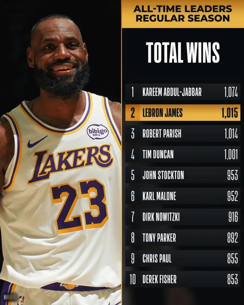 詹姆斯历史第2了,NBA生涯“胜场数”排名: 1、贾巴尔——1074场胜利 2、