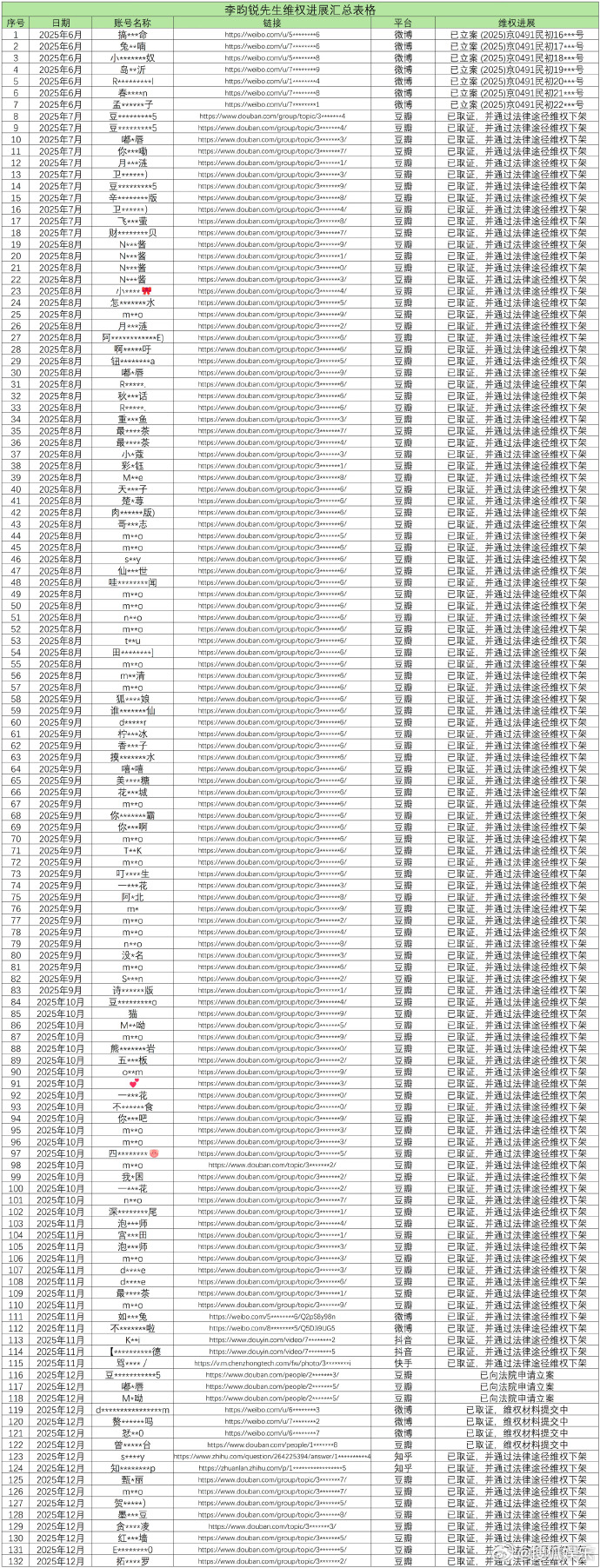 今日,李昀锐工作室更新针对132个侵权账号的告黑维权进度,其中多件已立...