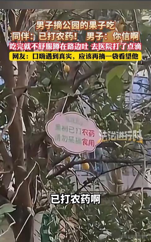“胆子真大!”四川,一男子和朋友逛公园时,见树上的果子已经成熟,就摘了一个吃[尬笑] 在公园散步时,看到枝头挂满果实,不少人会心生采摘的念头。但近期四川12月3日发布了一起事件提醒我们,这样的行为可能伴随风险。 一名男子因误食公园内的景观果实,出现身体不适并被送医。 城市中用于绿化的果树,其主要功能是观赏而非食用。为确保树木健康,园林养护部门通常会定期喷洒农药以防治病虫害。 这些化学药剂可能残留于果实表面或内部。因此,即便是自然成熟的果子,也可能不符合食用安全标准。 除了人为喷洒的药剂,一些植物本身的果实若处理不当,也可能引起不适。 综合来看,面对这些“诱人”的景观果实,最安全的原则就是不采摘、不食用。 许多公园会在果树旁设置“已喷洒农药,请勿采摘”的提示牌。游玩时留意并遵守这些规定,是保护自己最简单有效的方法。 家长尤其需要看管好小朋友,教育他们不要捡拾地上的落果。 如果不慎误食,并很快出现恶心、腹痛等异常反应,应立即停止食用并尽快就医。 如果条件允许,可以带上剩余的果实样本,以便医生更快做出诊断。 享受户外绿意时,多一份谨慎就能多一份安心。不碰触不了解的植物果实,既是对自身健康的负责,也是对公共绿地的爱护。 迅速引发了广大网友的热烈讨论。 “不听劝的代价有点大”。 “无语”,这种对明确警示视而不见、心存侥幸的行为,不仅让自己受苦,也浪费了公共医疗资源。 城市绿化果树为了防治病虫害,定期喷洒农药是常规操作,其果实根本不适合食用。 即便是自然熟落、没有农药的果子,长期暴露在街头,也难免受到汽车尾气、灰尘等污染,安全性毫无保障。 攀爬树木或使用工具击打枝条采摘,极易发生摔伤或误伤他人等安全事故,为了一点果子实在不值。 公共绿化果实是观赏性的公共财产,随意采摘首先是一种不文明行为,反映出对公共财物缺乏敬畏之心。 这种“不拿白不拿”的心态,与采摘银杏果、杨梅等事件中暴露出的问题如出一辙,不仅破坏环境美观,也体现了个人素养的缺失。 城市管理部门或许也可以考虑更主动的干预,比如果实成熟前由专业单位统一采摘并集中处理或分发,从源头上减少此类风险和行为。 对这类事件有什么看法?我们一起探讨如何更好地守护自身安全与公共环境。 信息来源:法治进行时