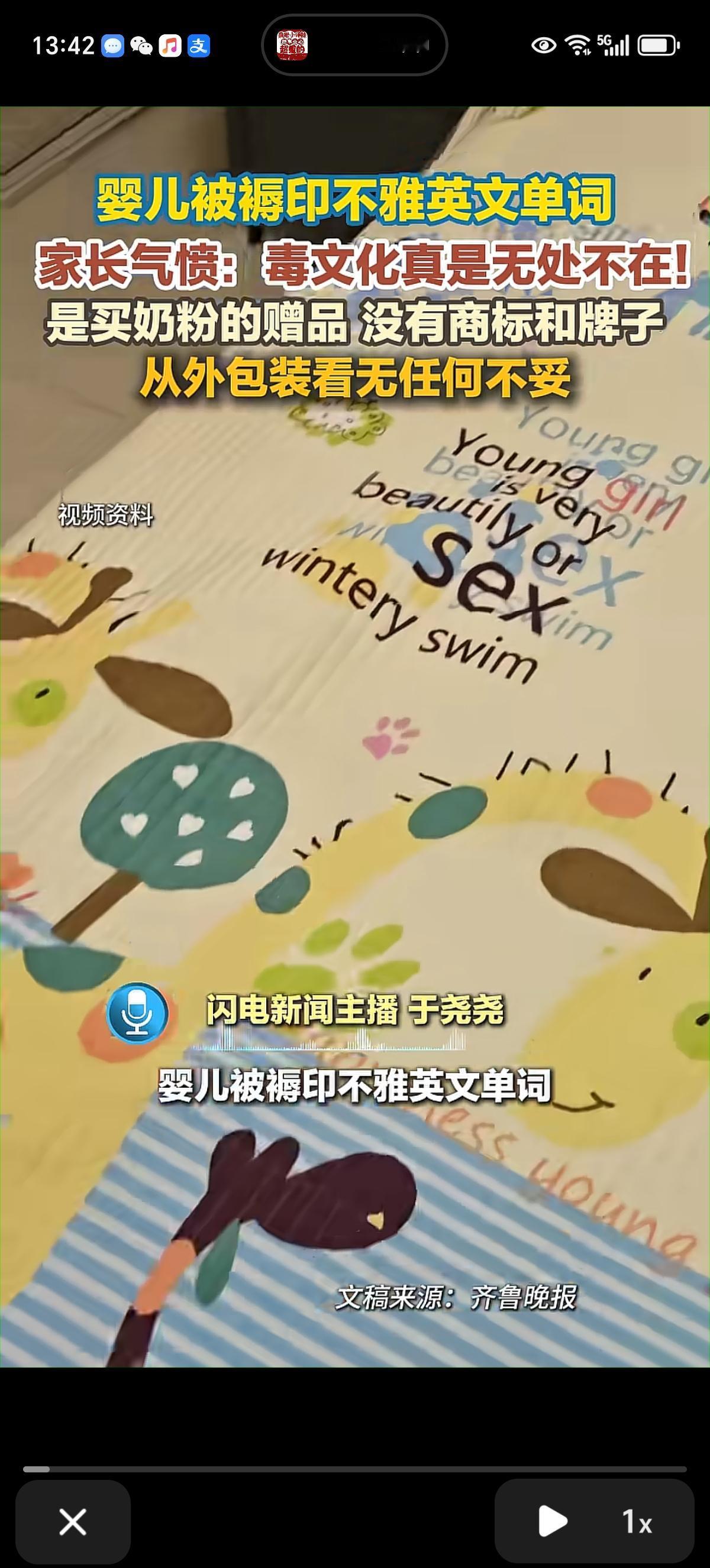 婴儿被子上印着““young is very beautily or,Sex,wintery swim”还有“fuck”的字样,这是买奶粉的赠品,给刚出生娃用的东西,还是买正经奶粉送的赠品,居然能藏着这种低俗内容。家长气得直骂“毒文化真是无处不在”, 想追究都找不到人,这个婴儿被是没有品牌商标的“三无”产品,只有一个水洗标上有四个韩文字体,一般人也看不懂,无法确认厂家、产地。