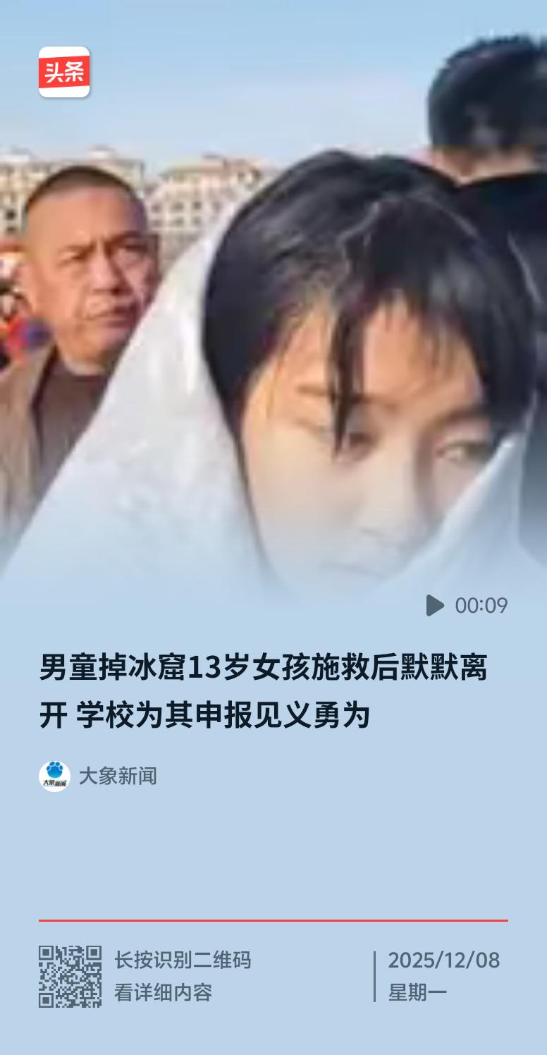 2025年12月6日,宁夏吴忠同心县人工湖,4岁男童坠入冰窟,13岁的李佳婷放学路过,毫不犹豫趴着用塑料管施救,自己却也掉进湖里。被救后她悄悄离开,回家还骗父母是被洒水车溅湿。 有人觉得她冲动,可岸上说话容易,水里救人分秒必争。她的勇敢和善良太让人感动。她家人也超棒,面对道谢家长的酬金坚决不收。学校为她申报见义勇为实至名归。网友说得好,不鼓励孩子冒这么大风险救人,但她做到了,就该把最高敬意和赞美给她! 冰湖落冰儿童