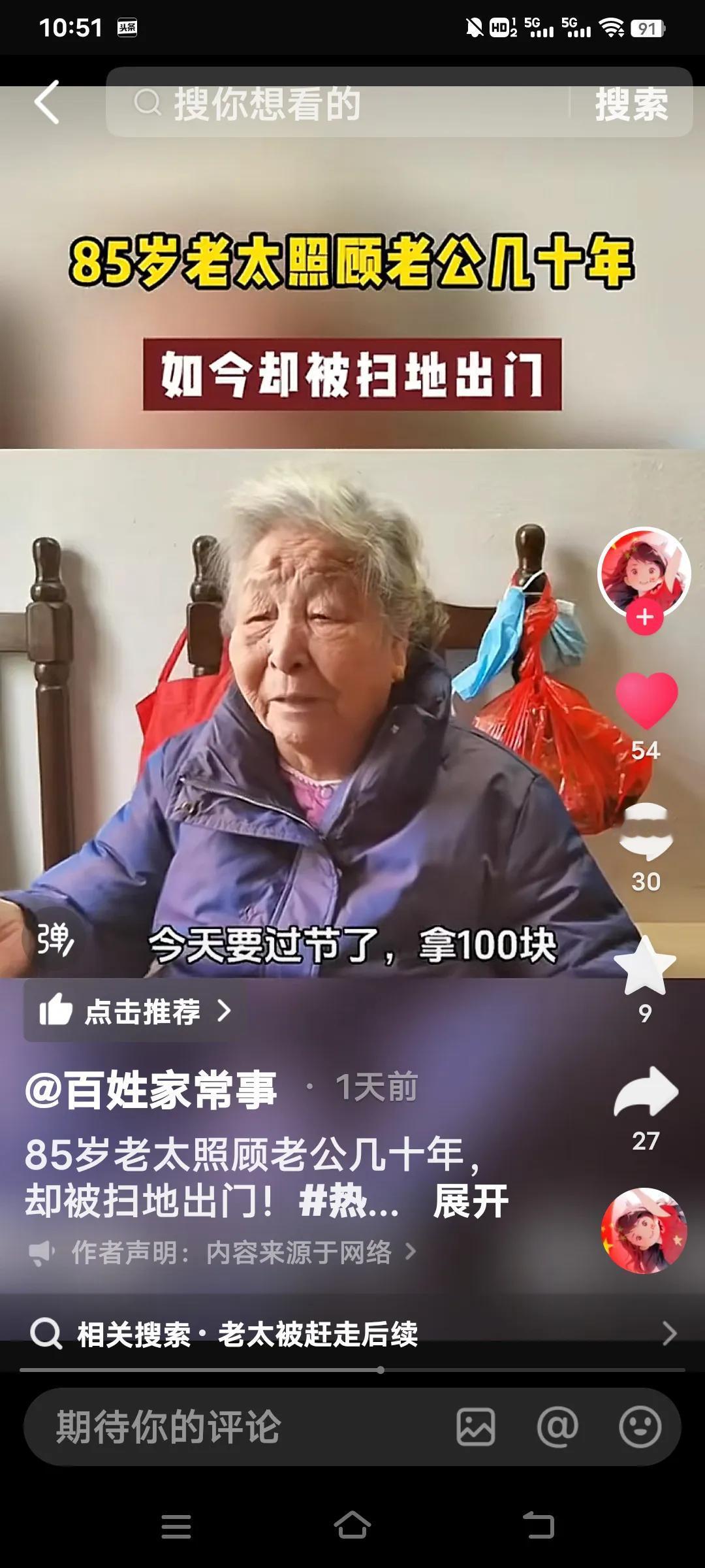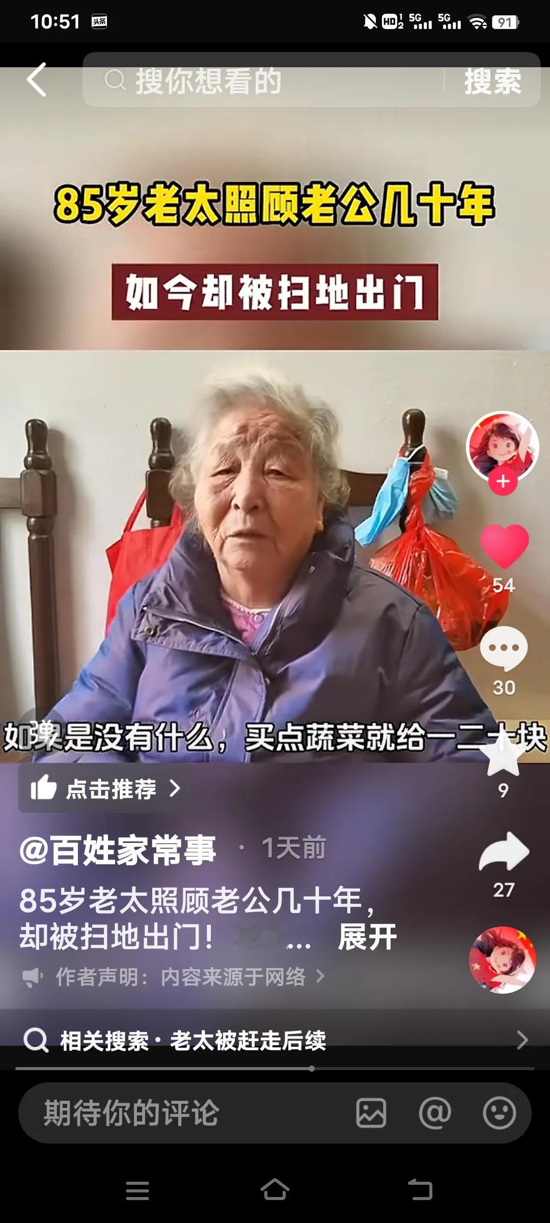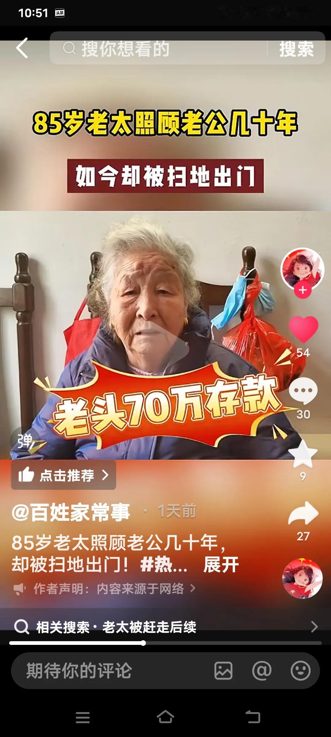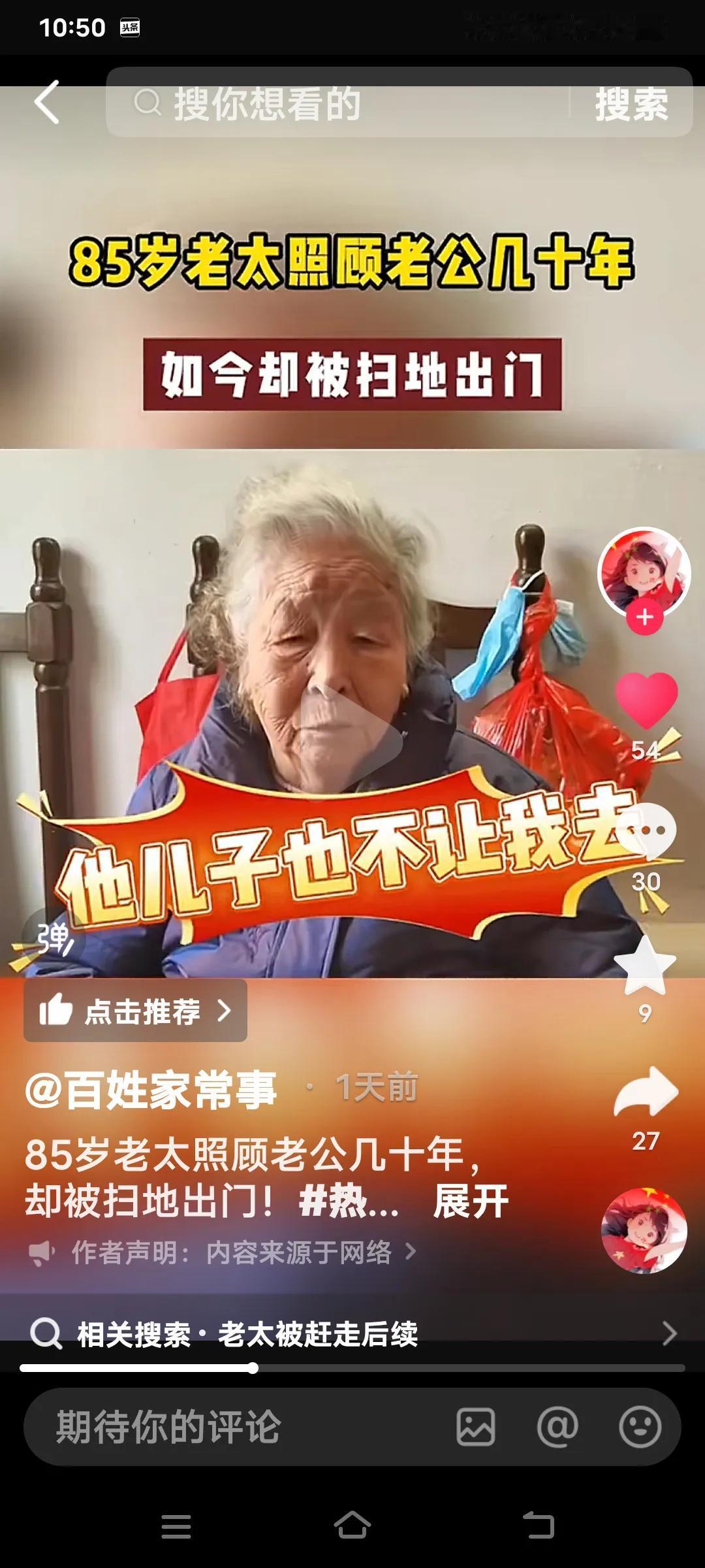 无论多大年龄结婚,都要嫁给人品,不要嫁给金钱,有钱没良心就是白搭了,看看这个你就知道了。 85岁的老太照顾老公27年竟然被扫地出门。她说她是59岁的时候嫁给这个上海老公,几十年如一日照顾他家老小。可现在老头93岁了想上敬老院,竟然把70多万存款都带走了,老太要去,他儿子不让去,老头有儿有女4个孩子。 她说说老头的大女儿还打她。真是一群白眼狼呀!老头还有6千多的退休金,怎么能对待自己生活27年的妻子那么狠毒呀! 老太说,她平时买菜30,50的给,过节给100,每次买菜回来剩的钱还都得上交一分不给老太太留。这样的日子坚持了27年,到老了还是一脚蹬了,真是没有意思啊? 不知道通过百姓家常事,可能有人帮助这位老太解决好呀?几十年的付出,没有功劳也有苦劳呀!不给一笔钱,这么大年龄了身无分文,该怎么办啊?婚姻现实解读 婚姻现实法则 婚姻择人标准 婚姻五原则