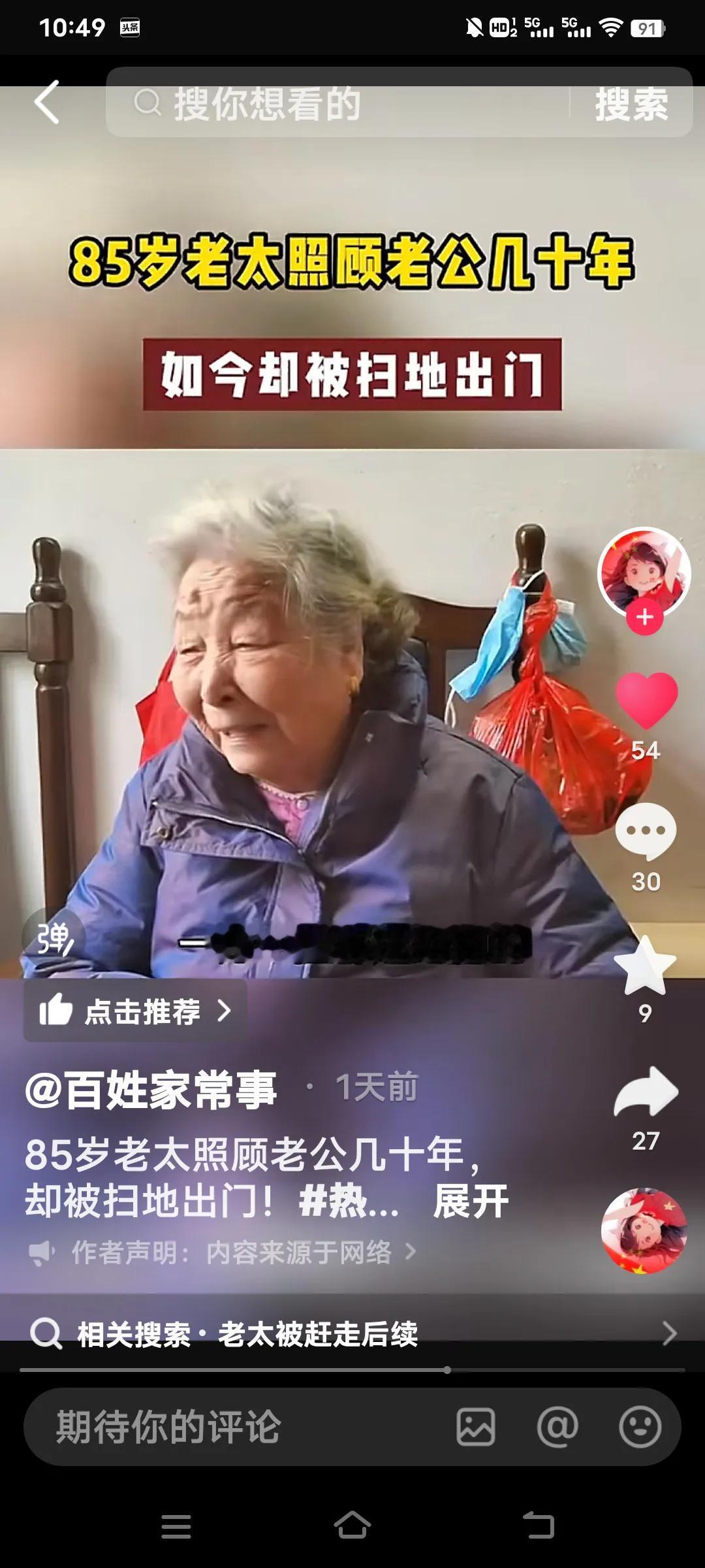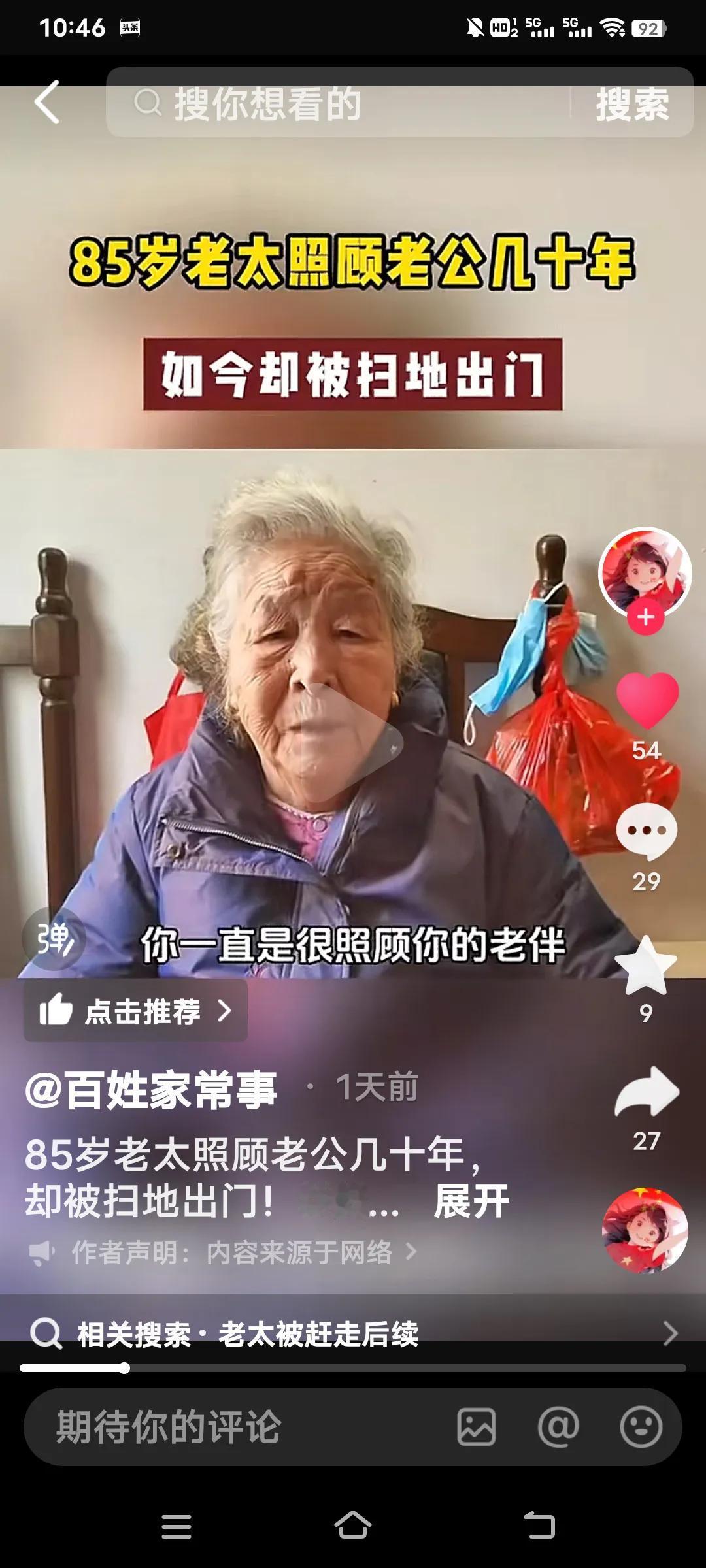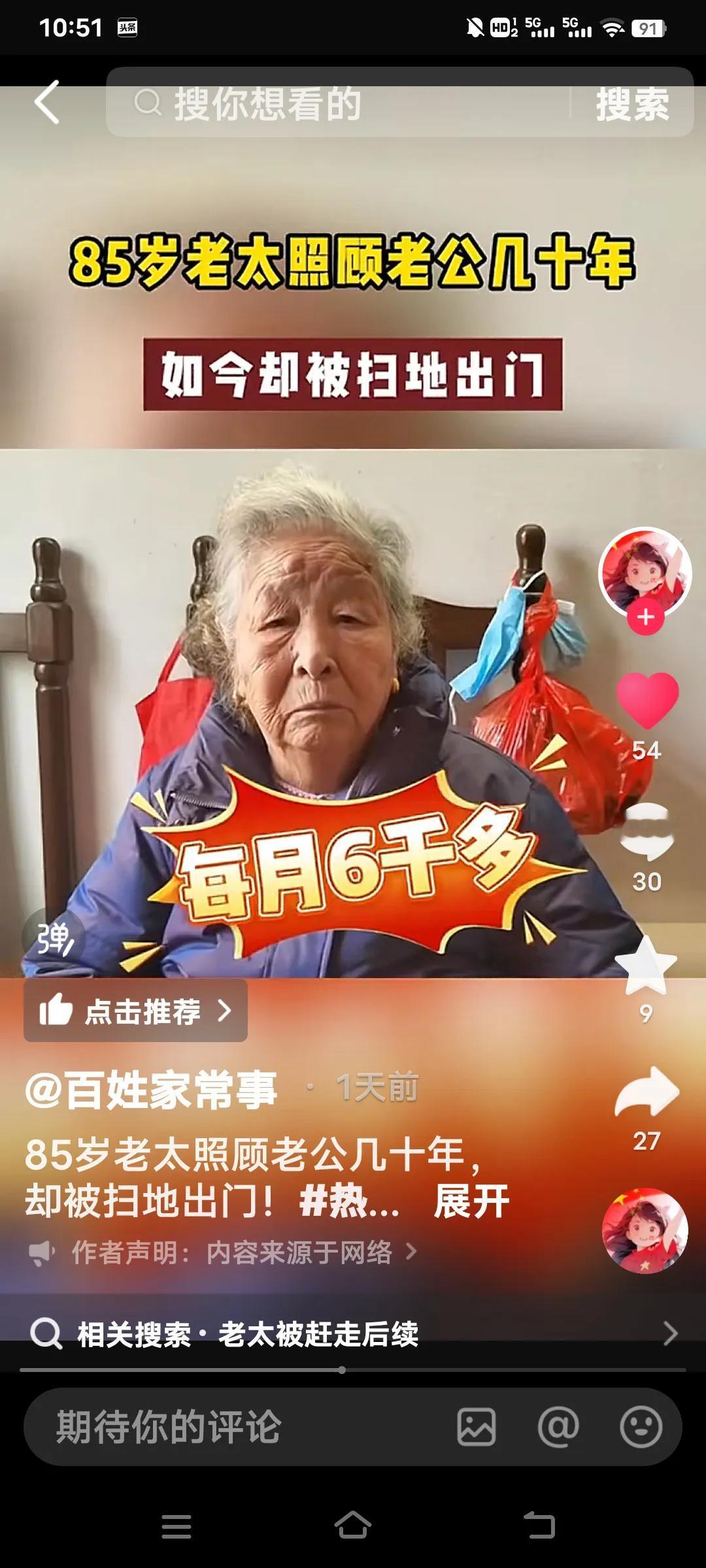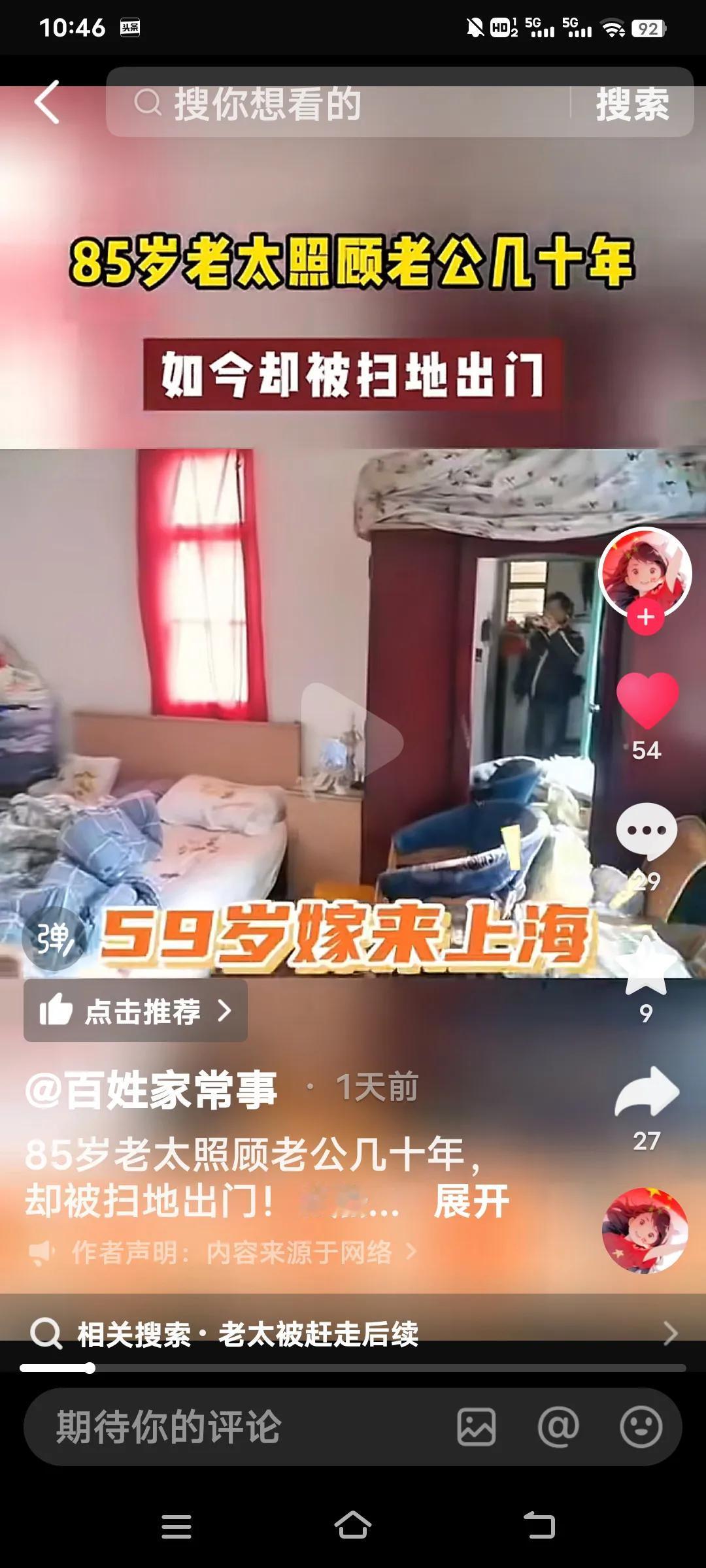 无论多大年龄结婚,都要嫁给人品,不要嫁给金钱,有钱没良心就是白搭了,看看这个你就知道了。 85岁的老太照顾老公27年竟然被扫地出门。她说她是59岁的时候嫁给这个上海老公,几十年如一日照顾他家老小。可现在老头93岁了想上敬老院,竟然把70多万存款都带走了,老太要去,他儿子不让去,老头有儿有女4个孩子。 她说说老头的大女儿还打她。真是一群白眼狼呀!老头还有6千多的退休金,怎么能对待自己生活27年的妻子那么狠毒呀! 老太说,她平时买菜30,50的给,过节给100,每次买菜回来剩的钱还都得上交一分不给老太太留。这样的日子坚持了27年,到老了还是一脚蹬了,真是没有意思啊? 不知道通过百姓家常事,可能有人帮助这位老太解决好呀?几十年的付出,没有功劳也有苦劳呀!不给一笔钱,这么大年龄了身无分文,该怎么办啊?婚姻现实解读 婚姻现实法则 婚姻择人标准 婚姻五原则