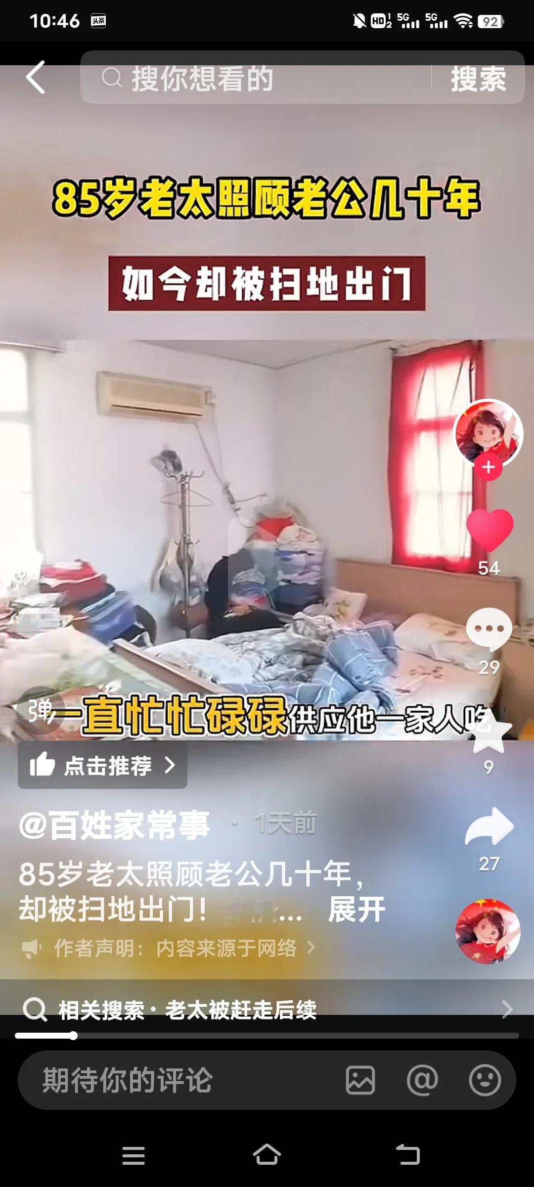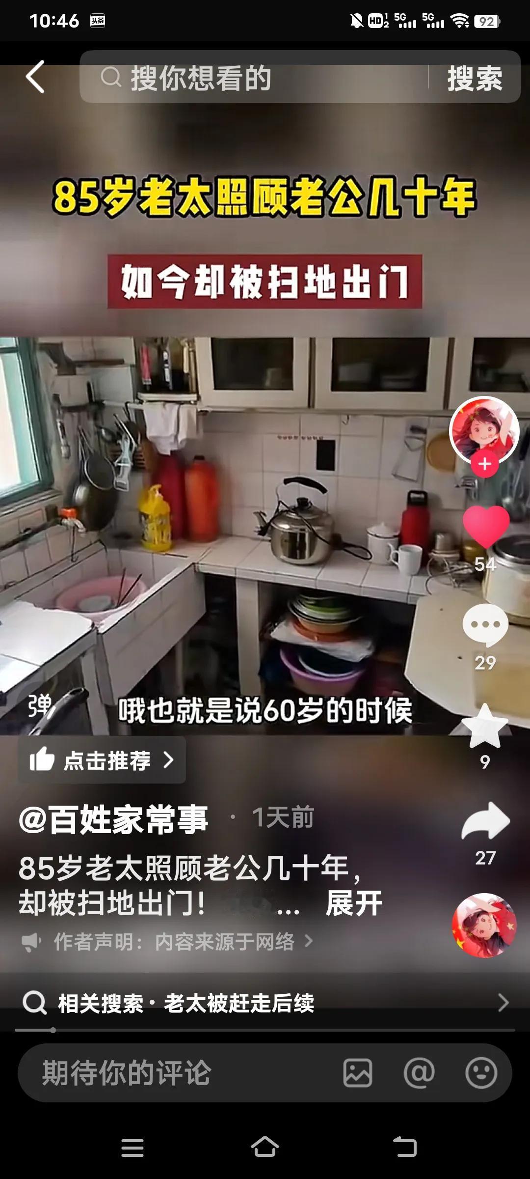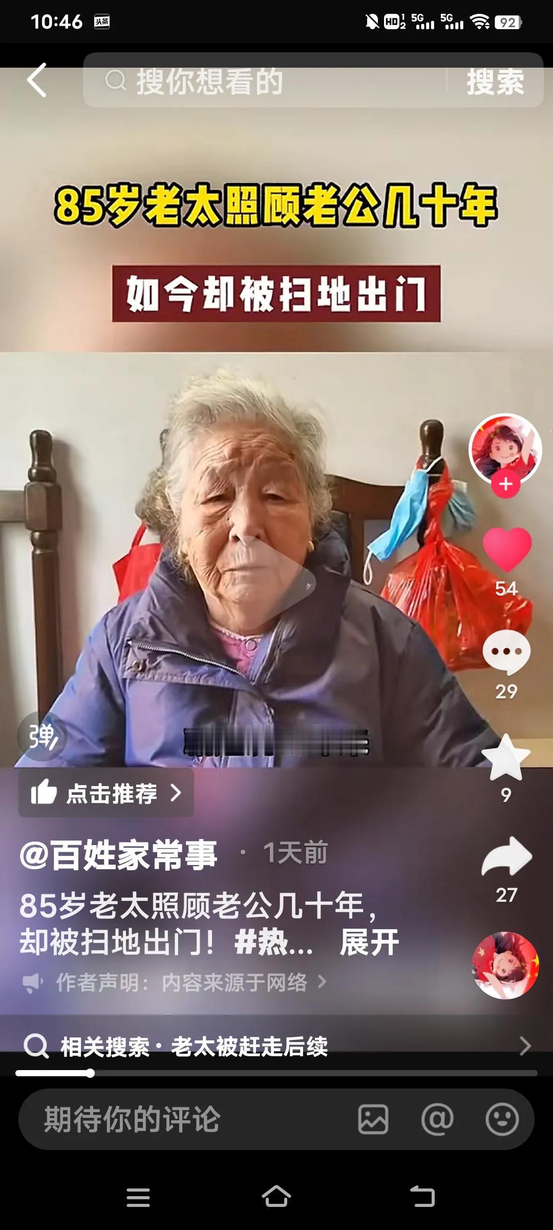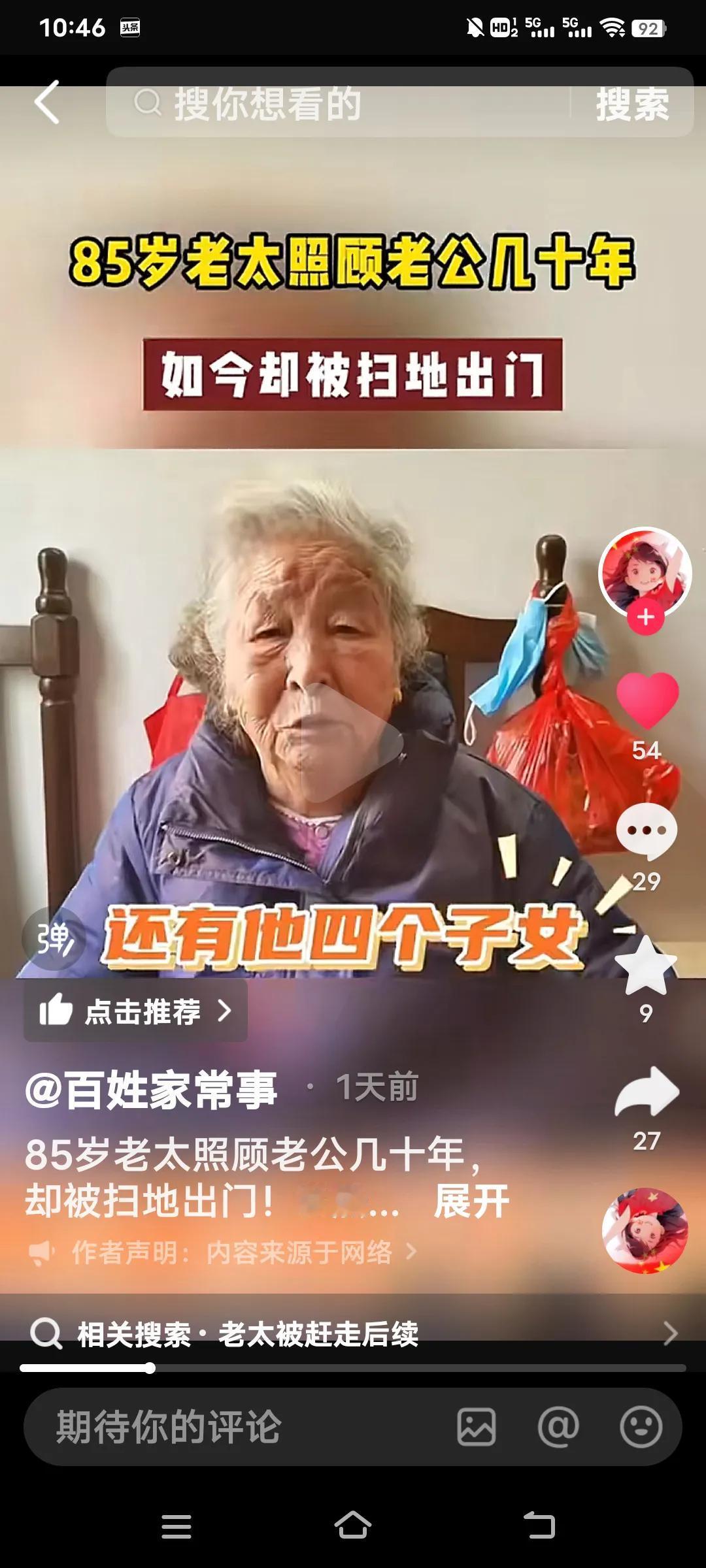 无论多大年龄结婚,都要嫁给人品,不要嫁给金钱,有钱没良心就是白搭了,看看这个你就知道了。 85岁的老太照顾老公27年竟然被扫地出门。她说她是59岁的时候嫁给这个上海老公,几十年如一日照顾他家老小。可现在老头93岁了想上敬老院,竟然把70多万存款都带走了,老太要去,他儿子不让去,老头有儿有女4个孩子。 她说说老头的大女儿还打她。真是一群白眼狼呀!老头还有6千多的退休金,怎么能对待自己生活27年的妻子那么狠毒呀! 老太说,她平时买菜30,50的给,过节给100,每次买菜回来剩的钱还都得上交一分不给老太太留。这样的日子坚持了27年,到老了还是一脚蹬了,真是没有意思啊? 不知道通过百姓家常事,可能有人帮助这位老太解决好呀?几十年的付出,没有功劳也有苦劳呀!不给一笔钱,这么大年龄了身无分文,该怎么办啊?婚姻现实解读 婚姻现实法则 婚姻择人标准 婚姻五原则
