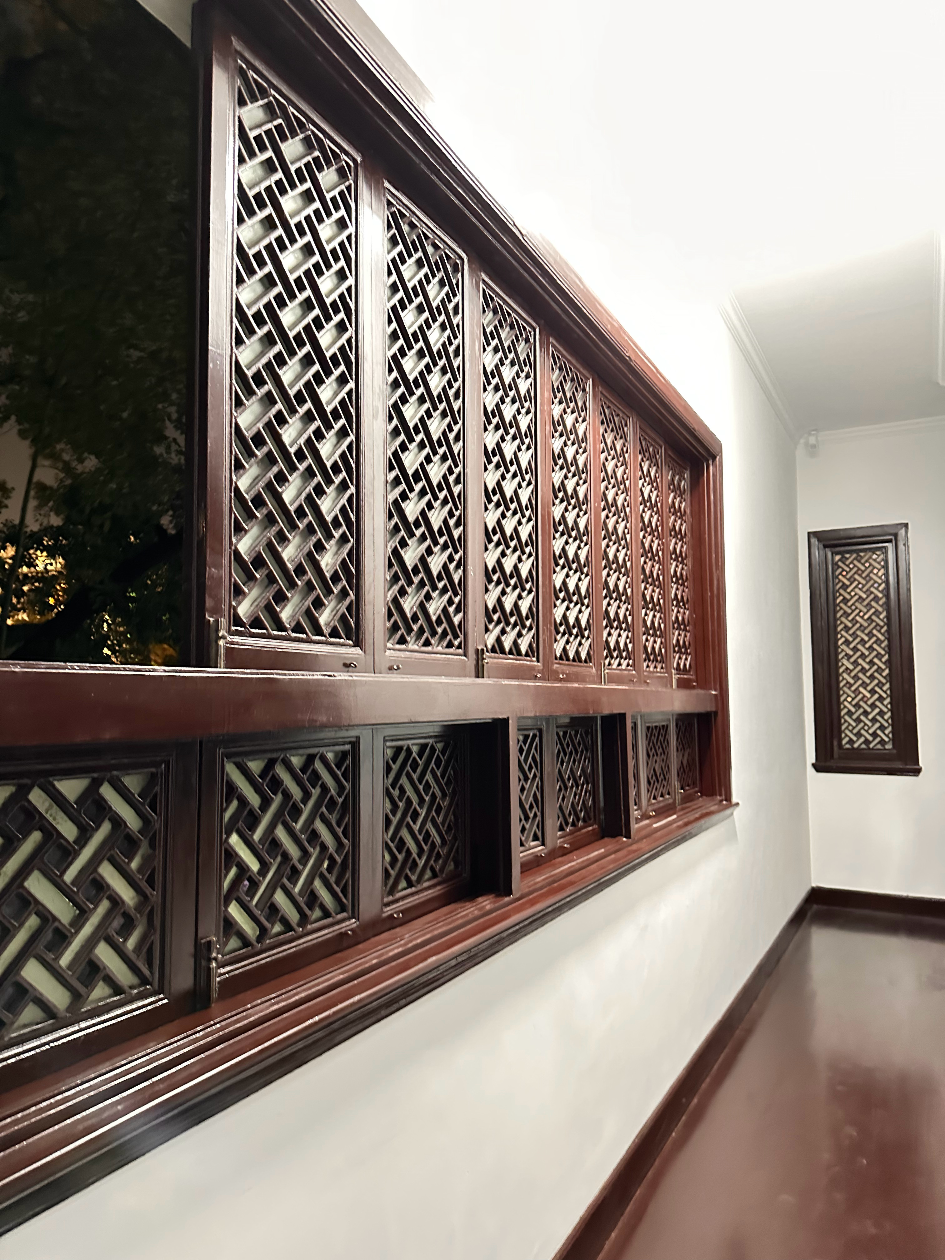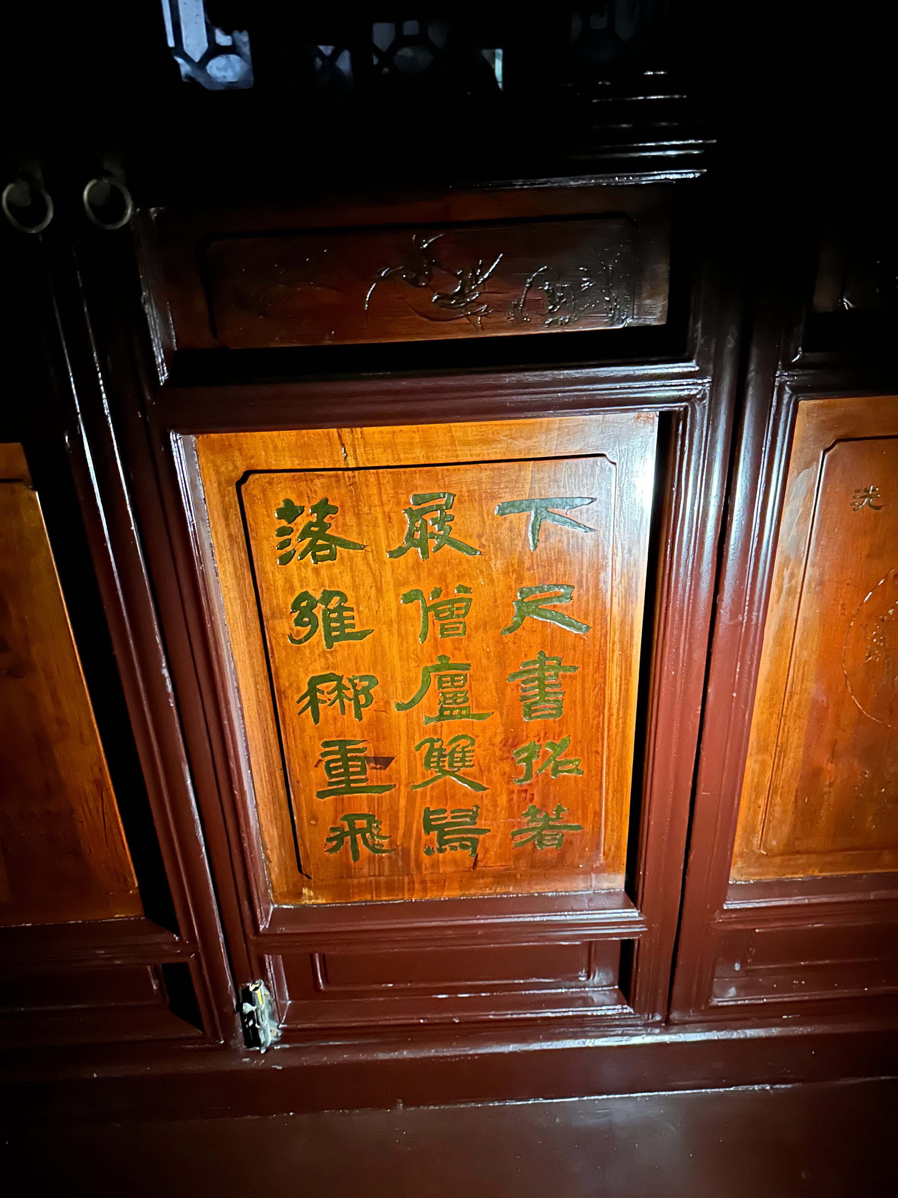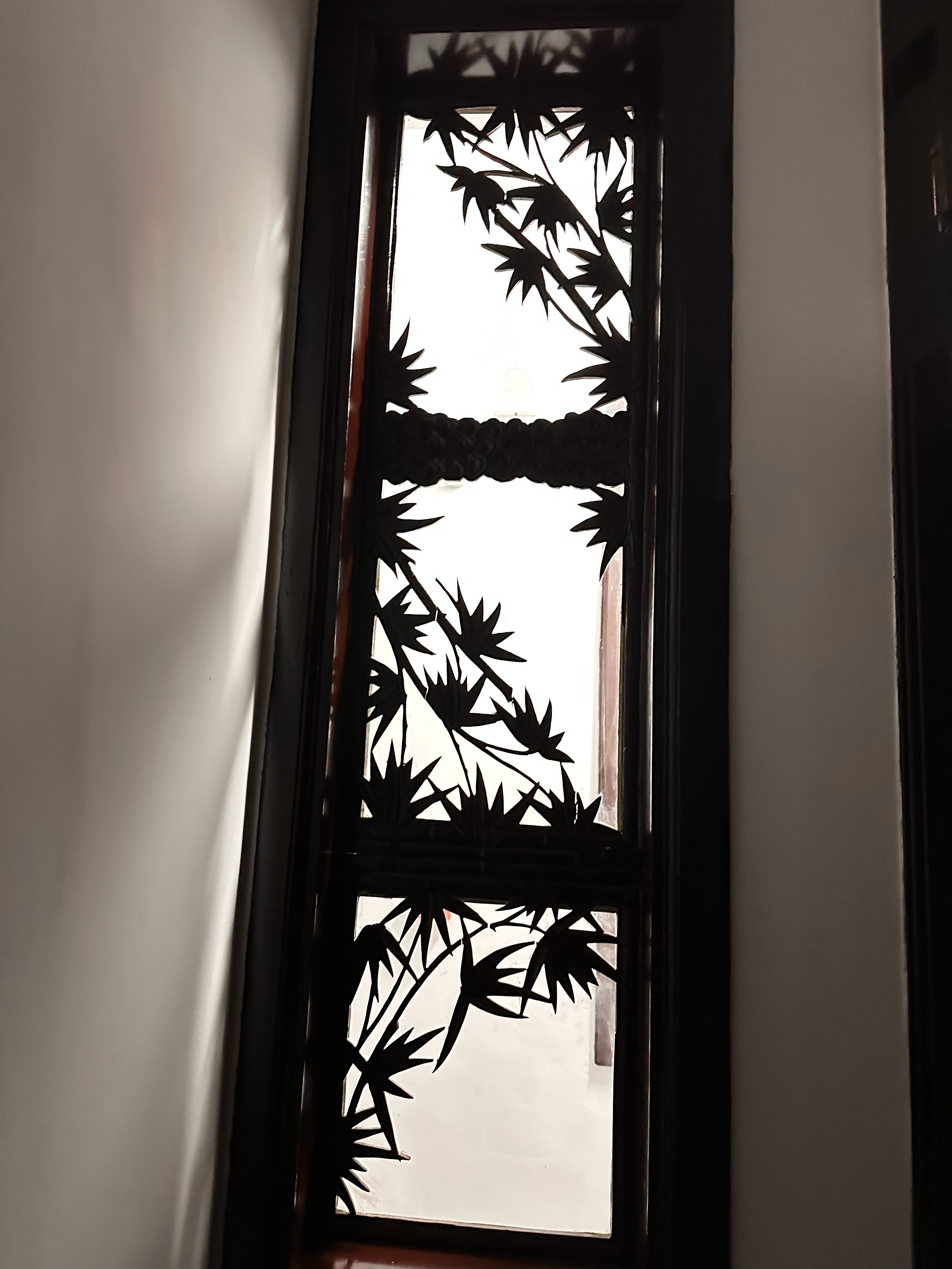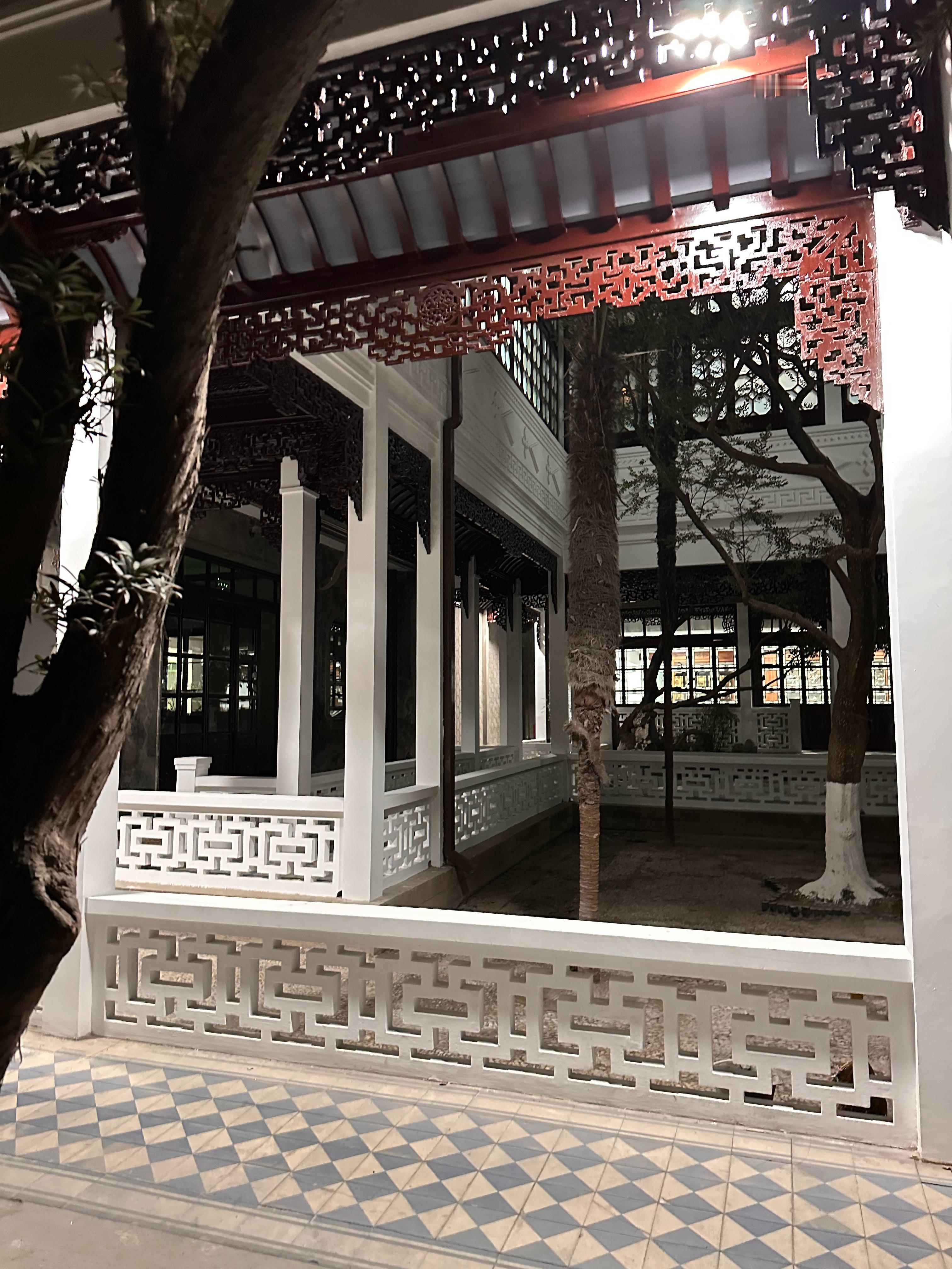 夜游天香小筑,楼上室内也大面积用了长窗,长窗裙板刻了很多诗文,绘画,古玩,类似罗苑湖天一碧楼,最前面的花厅屏门也装饰青铜器古玩图案,原图案里应有填色和细螺钿粉末,现在全部涂成红色,天香小筑最好的是楼和廊的空间组合,很妙