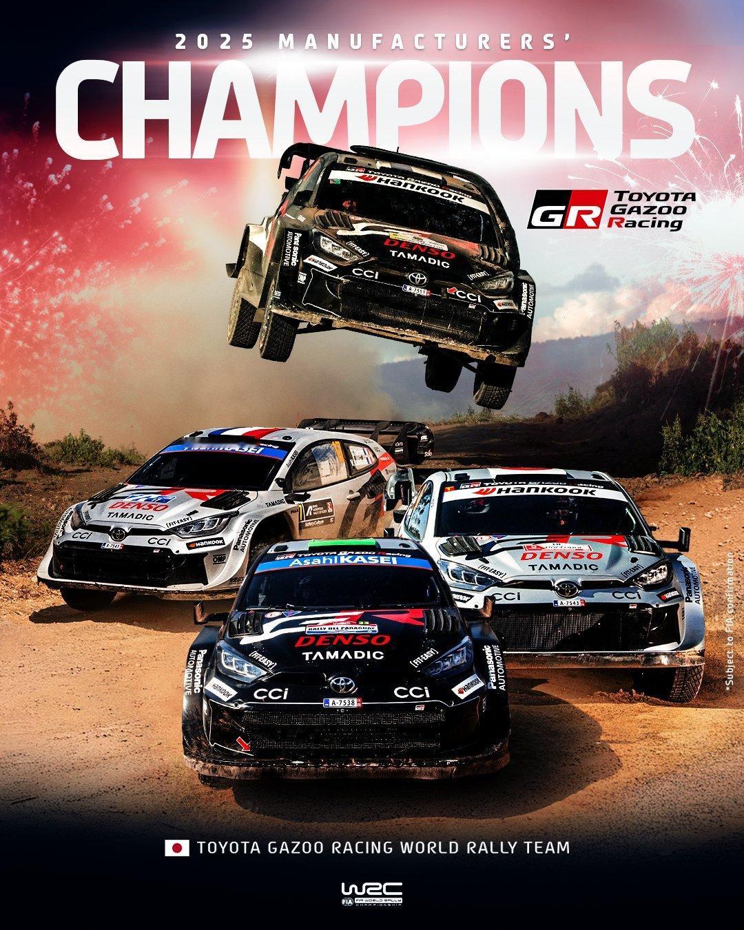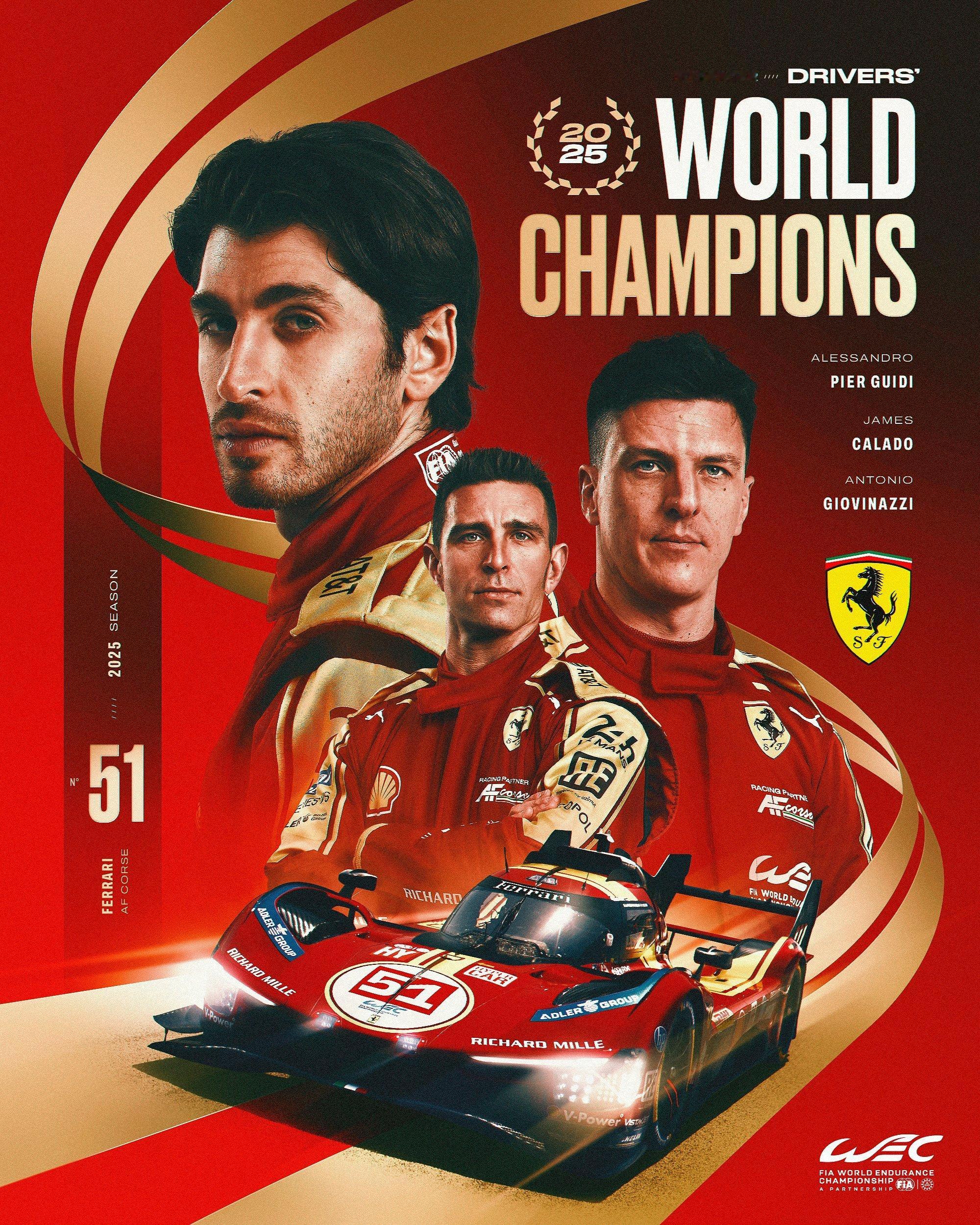 2025赛季,其实还不错啦~随着兰多·诺里斯在本赛季F1的终局之战中顺利加冕,本年度FIA各个世锦赛的世界冠军得主也最终全部确定。有意思的是,除了FE之外,其实今年大部分世锦赛的车手世界冠军全部都需要在赛季的收官战上决出;尽管里头好一些的争冠悬念并没有很大,不过也有像W2RC里莫莱斯的迷之逆转,还有就是奥吉尔终于达成九冠壮举,这都是相当让人印象深刻的。最后,给小伙伴们汇总一下今年除KWC外六个主要FIA世锦赛的冠军得主,顺带分享他们各自的结算画面……🏁 F1世界一级方程式锦标赛🏆️ 年度车手冠军 - 诺里斯🥇 年度制造商冠军 - 迈凯伦🏁 WEC世界耐力锦标赛🏆️ 年度车手冠军 - 乔维纳兹 / 皮尔圭迪 / 卡拉多🥇 年度制造商冠军 - 法拉利🏁 WRC世界拉力锦标赛🏆️ 年度车手冠军 - 奥吉尔🥇 年度制造商冠军 - 丰田🏁 FE电动方程式世界锦标赛🏆️ 年度车手冠军 - 罗兰🥇 年度车队冠军 - 泰格豪雅保时捷车队🏁 W2RC世界越野拉力锦标赛🏆️ 年度车手冠军 - 莫莱斯🥇 年度制造商冠军 - 丰田 🏁 WRX世界Rallycross锦标赛🏆️ 年度车手冠军 - 克里斯托弗森🥇 年度车队冠军 - KMS恭喜以上的冠军得主,另外今年的FIA年度颁奖礼将会于12月12日(本周五)在乌兹别克斯坦的塔什干举办,丰田这次没能把自己跑的所有世锦赛赛车都带到现场,而法拉利则是久违地有一款赛车能够参与这一盛典,哈哈!期待2026会有一个更让车迷难忘的精彩赛季,来年再见!赛车