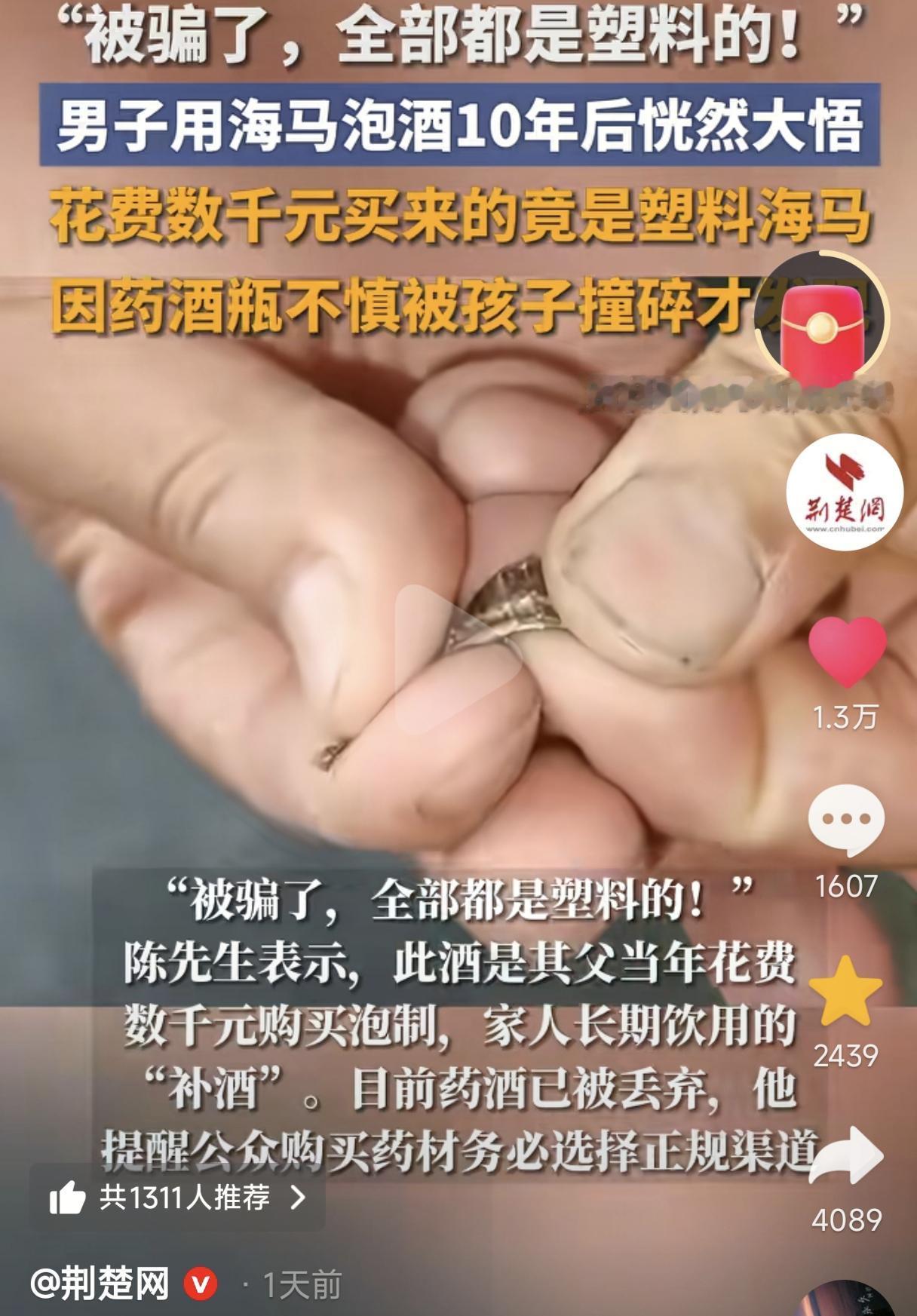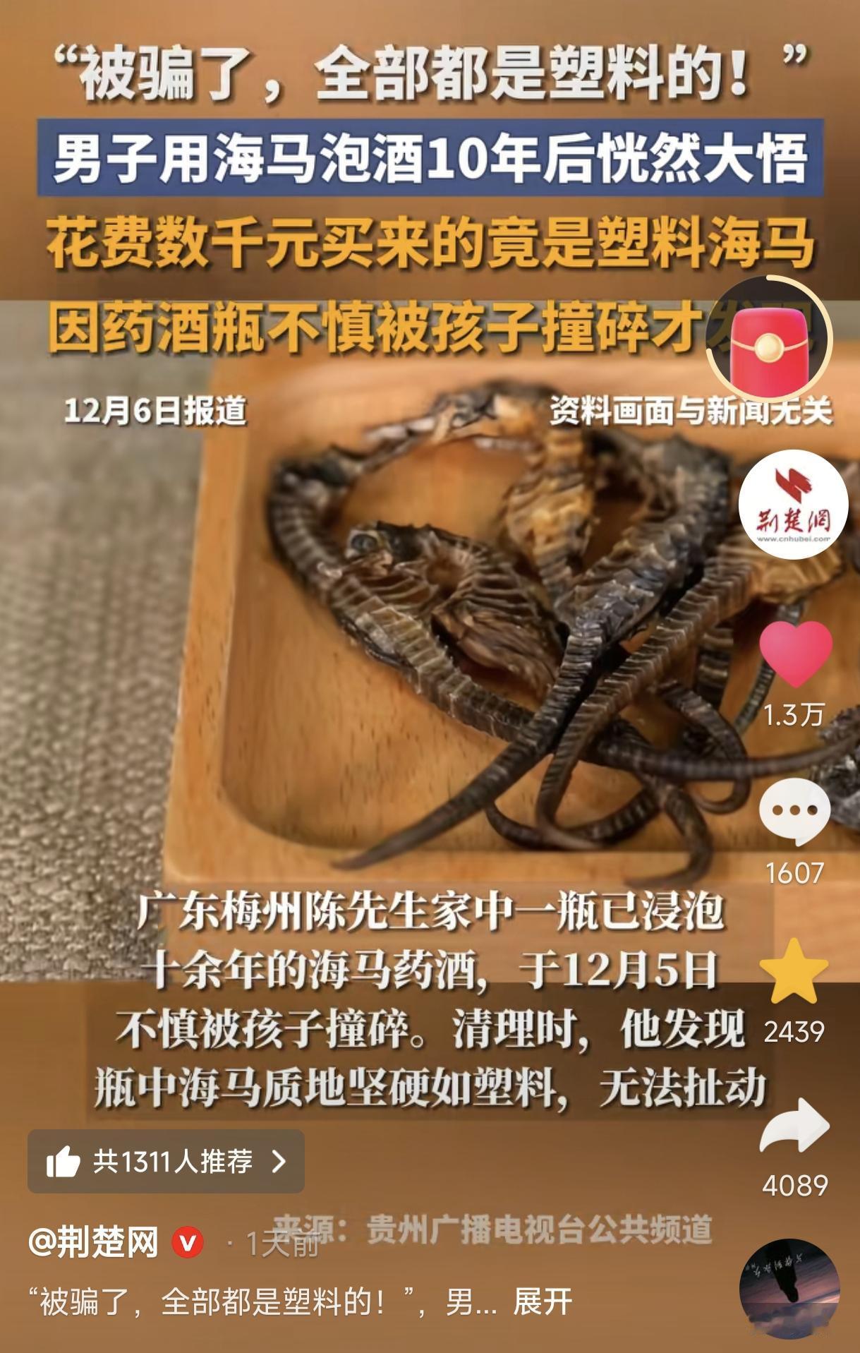 “被骗了 全是塑料!” 广东梅州,孩子玩耍时不小心打碎几千块钱的海马酒,爸爸过来收拾,惊讶地发现泡了10多年的“海马”竟然坚硬如塑,扯都扯不动,这才得知被骗了,可全家人一直把它当作“补酒”在饮用。 (来源:荆楚网) 12月5日,广东梅州陈先生家中,孩子在玩耍时不慎碰倒并摔碎了家里浸泡海马的酒瓶,陈先生只得去收拾残局,没想到竟让他发现了一个10多年之久的真相。 陈先生在捡拾这些“海马”过程中,突然觉得手感很不对劲,就尝试着拉扯了一下,没想到根本无法扯动,那看上去长得十分逼真的“海马”竟然坚硬得如同塑料一般。 也就是说,那根本不是海马,而是塑料! 要知道,海马是一种名贵的中药材,用它泡制成的海马酒也是一种传统养生酒,有调气活血、散结消肿等功效,长期适量饮用还能增强免疫力、抗疲劳等,深受养生人士喜爱。 陈先生家中这瓶海马酒,是其父亲十余年前斥资数千元购置原料后亲手浸泡而成的一款养生补酒,关键全家人都在长期饮用(除了孩子)。 没想到,多年后,因孩子不小心的这么一撞,才让陈先生发现那“海马”竟然全都是塑料做的,自己一家都被骗了!这令他非常生气,将“海马酒”全部丢弃了。 之后,陈先生便把自家受骗上当的这一经历发布到了网上,以提醒大家在购买中药材时一定要注意选择正规渠道及正规店铺,以免上当受骗。 网友们对此,议论纷纷。有网友说,得亏孩子这一撞,小孩立了大功,保住了一家人性命,不然还得继续喝塑料药酒下去。 也有网友说,我爸也是用海蛇泡酒十几年,每次还跟人吹嘘有多好多好的功效,结果有天不小心打翻了酒缸,才知道海蛇是塑料的。 还有网友分享说,海马干,有一股子海腥味,我在福建海边尝过好几次,没味的估计都是化学药品泡过了。 更有网友说,现在假货太多,我觉得买真正的海马应该到沿海地区或直接找渔民,或许能买到真货。 此案中,孩子失手撞碎的何止是一瓶酒,更是一个家庭对名贵滋补的十年执念。花了数千元、泡了十多年的海马竟然不腐反而坚硬如塑,这也太荒诞了。 海马作为名贵中药材的功效有没有被神化?我认为不要过度迷信,否则会让商贩有可乘之机,加之如不了解药材,却盲目跟风,必会沦为骗局的目标。 此案例给我们敲响了警钟:养生不是对名贵盲从,而是对健康负责,我们只要多一份常识与鉴别,少一份执念与盲从,才能避开那些披着传统外衣的骗局。 还有,买名贵中药材时,一定要选择好正规渠道,否则花了一大笔钱,结果却买来假货换来荒唐的结局,那就得不偿失,贻笑大方了!