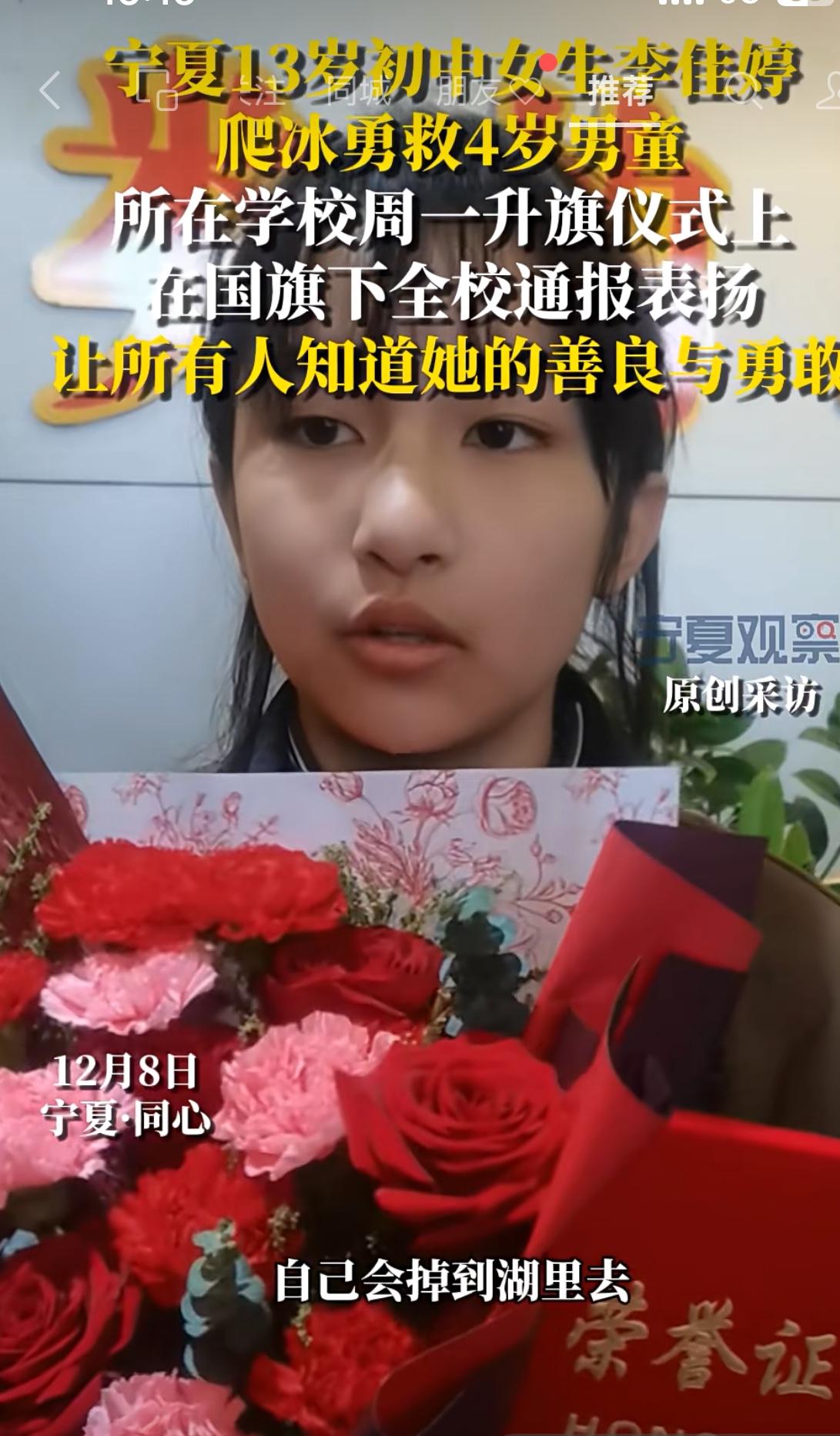 1万元嘉奖,终身免费体检,学校周一升旗仪式上全校通报表扬,那个13岁女孩爬冰救4岁男孩的事迹被表扬,县委,县政府及学校都来了表彰。 这份善意必须被托举,这份善良与勇敢必须被表扬。 内心强大的女孩,有大爱,有格局。这份精神就该被弘扬,这才是社会的正能量,官方的态度让老百姓心安。 寒风刺骨的冬天,一个孩子用生命去救了另一个生命,这种爱和母爱一样无畏,做了好事并没有大肆宣扬,就连家长都是看到视频才知道,这就是雷锋的精神。 善良美丽的女孩,让我们看到了美好的祖国的新一代,就是有这样的孩子,才能使我们国家的精神文明发展更快更美好,民族才更有灵魂!!!