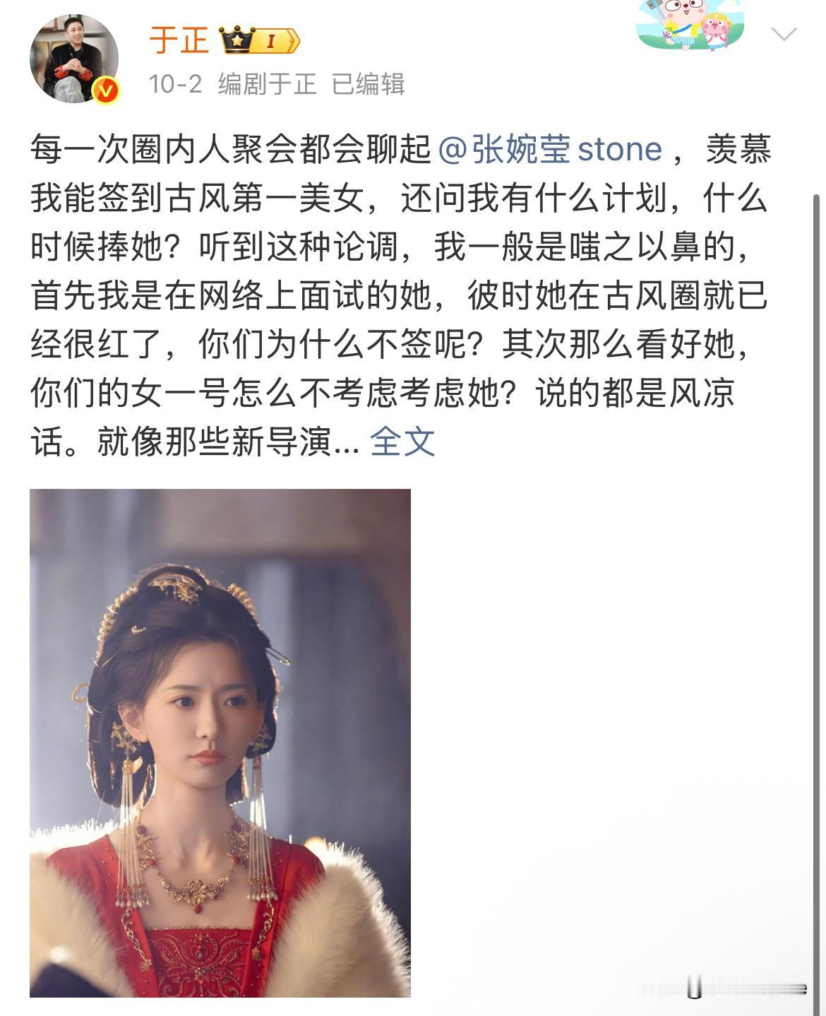 12月8日,于正不捧她,为什么还要签她? 张婉莹入职欢娱1年,如今状态与之前判若两人!当初于正把她的美貌夸上天,所有人都以为她会是于正接下来力捧的对象,结果这一年基本都在各个剧里打酱油,如今说是有个女一号了,可剧的质量一般…… 于正现在力捧赵晴,能给张婉莹的资源不多,欢娱本身资源也有限,基本都得靠合作或者置换才能拿到,张婉莹这部剧据于正说是她自己面试上的,她这个年纪,这个状态,在内娱不上不下,因为于正之前的夸赞,大家反而不在意她的颜值,单凭演技,非科班出身的她,很难出头……