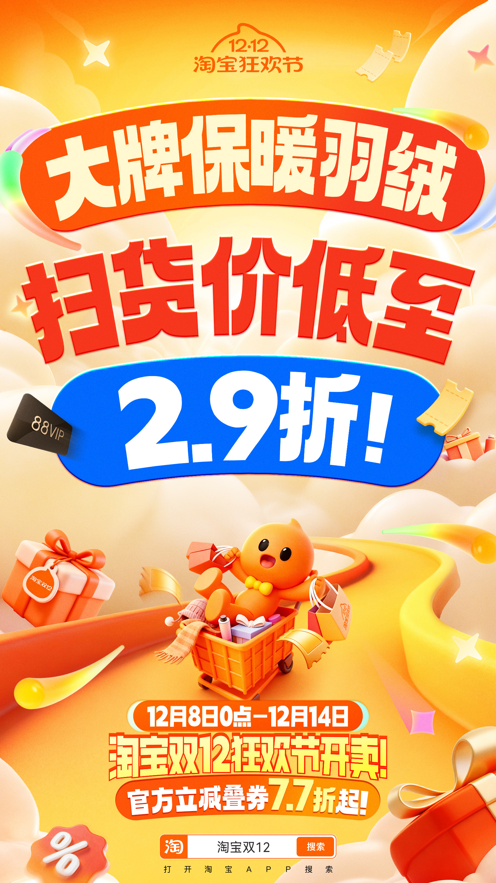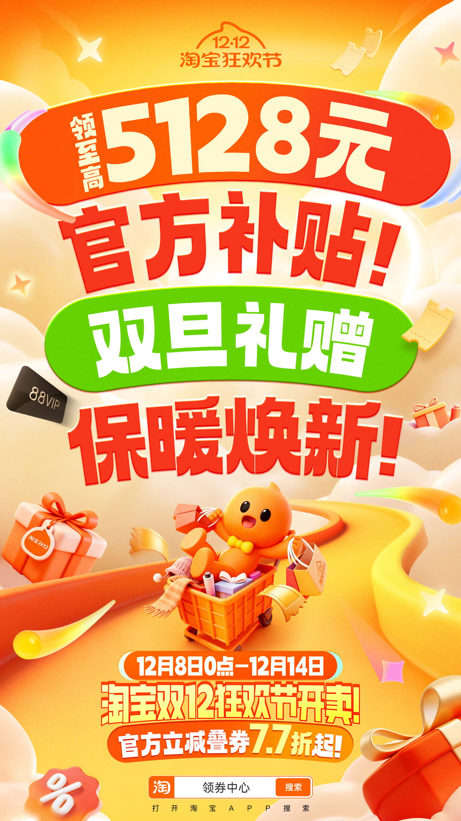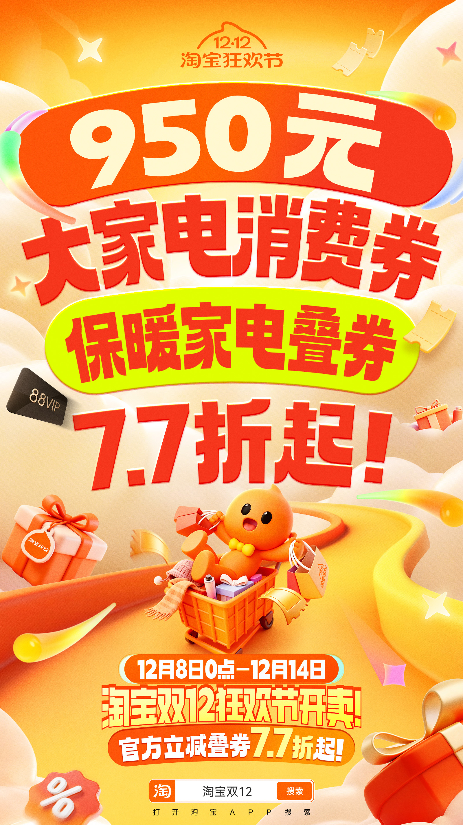 年末犒劳自己,就趁现在!淘宝双12来了 即日起到12月14日,8历史折扣新低88VIP消费券,还有950元大家消费券,想给家里换新家电的宝子们可以冲了!官方立减商品叠券7.7折起!大牌双旦好礼、数码新品叠国家补贴更是低至5折起!降温也不怕,可领双旦礼赠保暖焕新官方补贴,大牌保暖羽绒扫货价低至2.9折!年末扫货价,就上淘宝双12!双12上淘宝扫货价带走