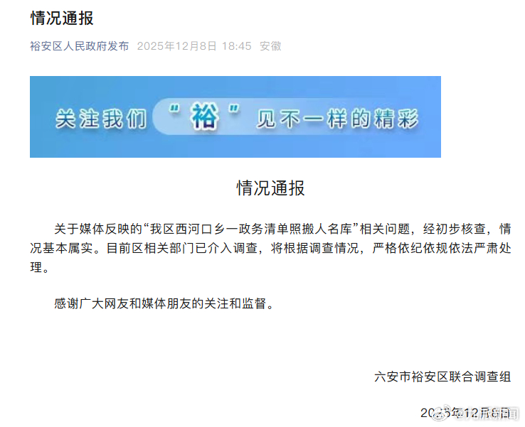 关于媒体反映的“我区西河口乡一政务清单照搬人名库”相关问题,经初步核查,情况基本属实。目前区相关部门已介入调查,将根据调查情况,严格依纪依规依法严肃处理。感谢广大网友和媒体朋友的关注和监督。
