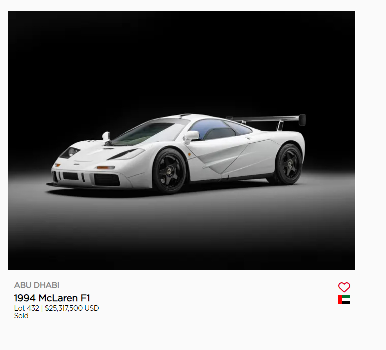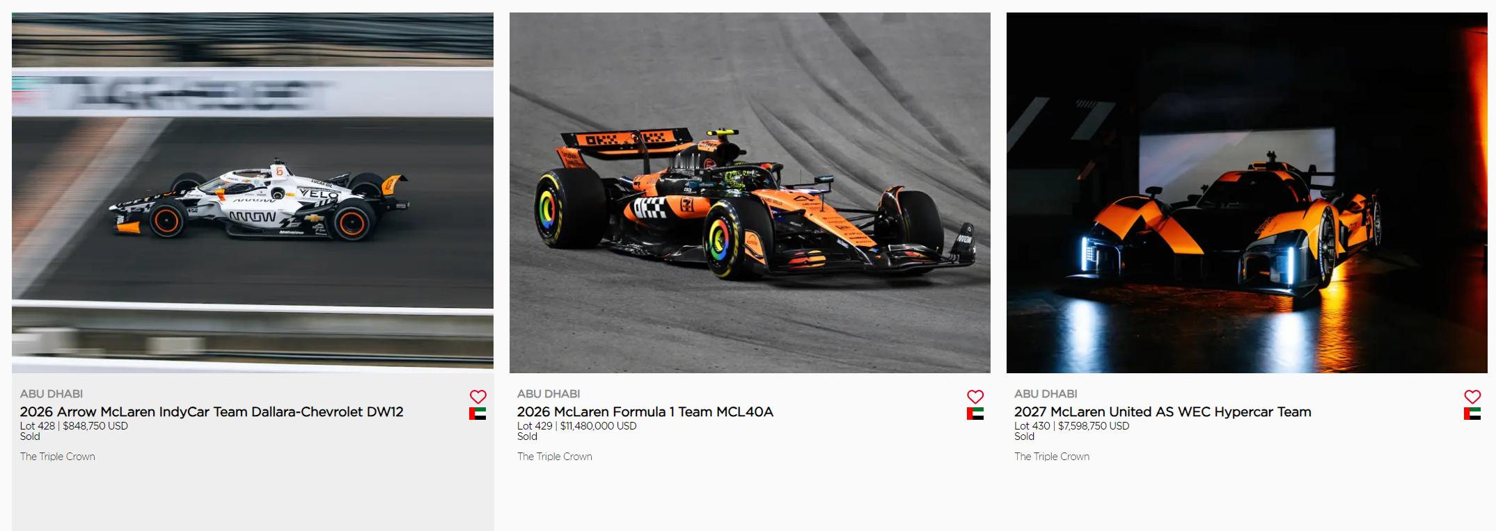 12月阿布扎比RM苏富比拍卖会圆满落幕,本次拍卖会上共计30件拍品,最终只有5件未能成交。本次拍卖会的最大焦点,一台稀有的1994款迈凯伦F1跑车(底盘号014)。最终以近2200万欧元的价格成交。这台车最初出售给文莱苏丹,随后又被迈凯伦汽车前负责人 David Clark 收购。这台车之后被带到美国,在仅5000 公里的行驶里程下进行过全面翻新。拍卖会上,迈凯伦车队的另外三部赛车也被拍出了高价,其中,由迈凯伦United AS将在2027年投入使用的Hypercar赛车。最终成交价超过650万欧元。车主需要等到2027赛季结束之后才能正式收到这台赛车。届时,车主将获得一本记录该底盘完整参赛历史的纪念册、一套由车手签名的赛车服,并将受邀作为VIP在未来两年里亲临现场参与勒芒24小时耐力赛、INDY500以及F1摩纳哥的比赛周末。同时,还将享有位于沃金的迈凯伦技术中心的私人参观机会。另外两部单座方程式赛车,2026款的F1赛车以近1000万欧元的价格成交,而2026年的INDYCAR赛车则拍出了72.8万欧元。
