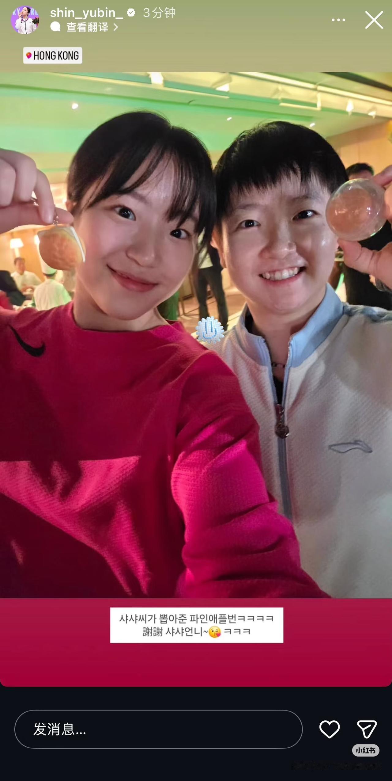 申裕斌分享自己和孙颖莎的合影并配文:莎莎姐姐送我的菠萝包, 谢谢你莎莎姐姐! 孙颖莎的影响力太大, 没有语言的障碍, 12月8日,香港总决赛 大合照和赛前晚宴, 外协运动员都和孙颖莎合影, 莎莎成了打卡点了, 这就是人格魅力, 实力雄厚的人会被人尊敬, 毕竟大家都慕强! 12月10日的赛程已经出炉, 孙颖莎加油, 国乒加油,必胜!