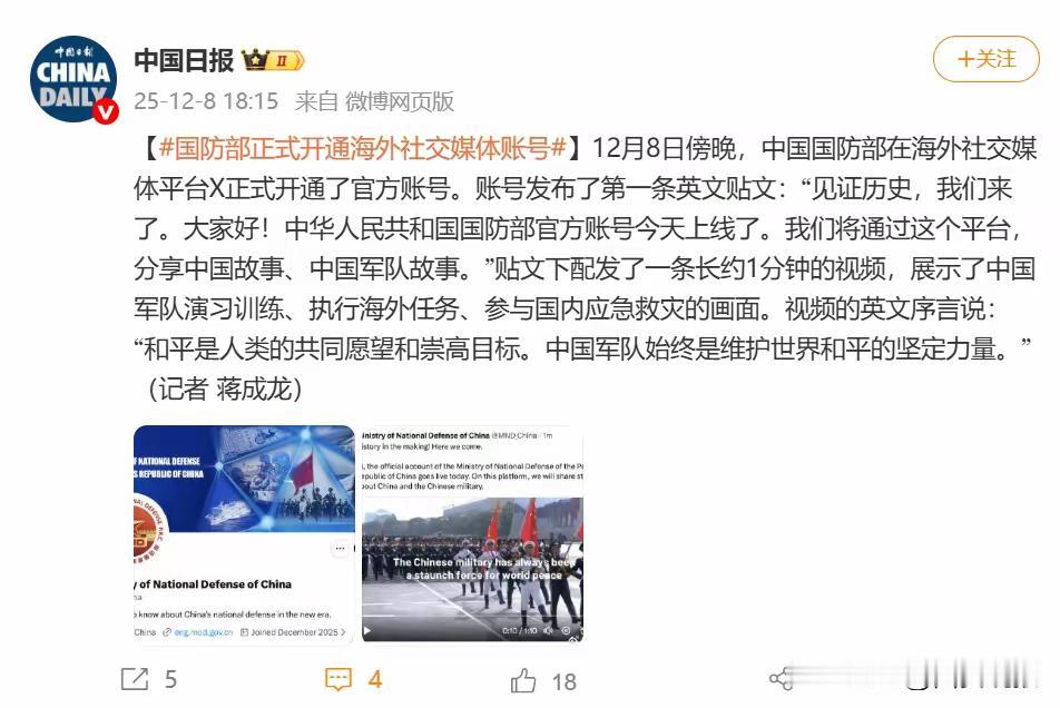 见证历史,更要“开创历史”! [加油][加油][加油] 12月8日傍晚消息,中国国防部在海外社交媒体平台X正式开通了官方账号。账号发布了第一条英文贴文:“见证历史,我们来了。大家好!中华人民共和国国防部官方账号今天上线了”。