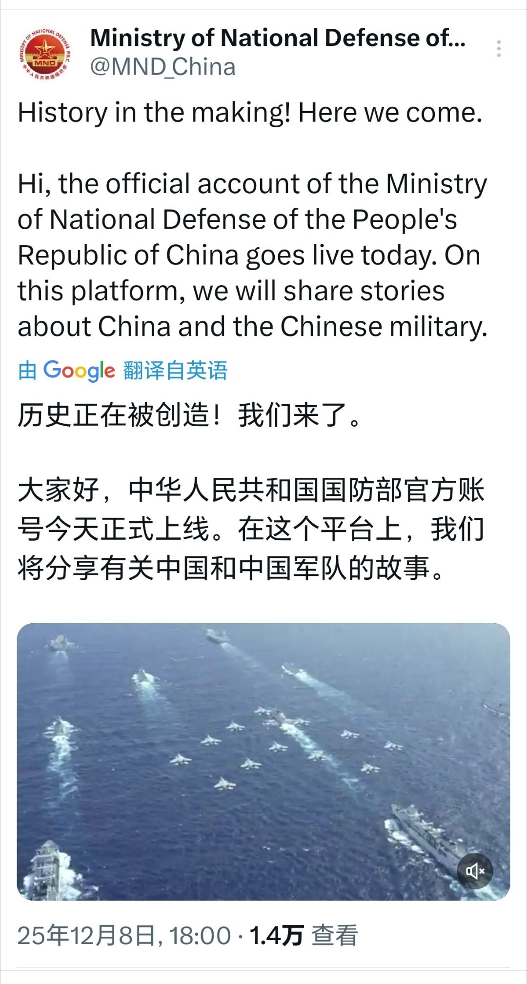 国防部开通海外社交媒体账号12月8日,中国国防部在海外社交媒体平台X正式开通了官