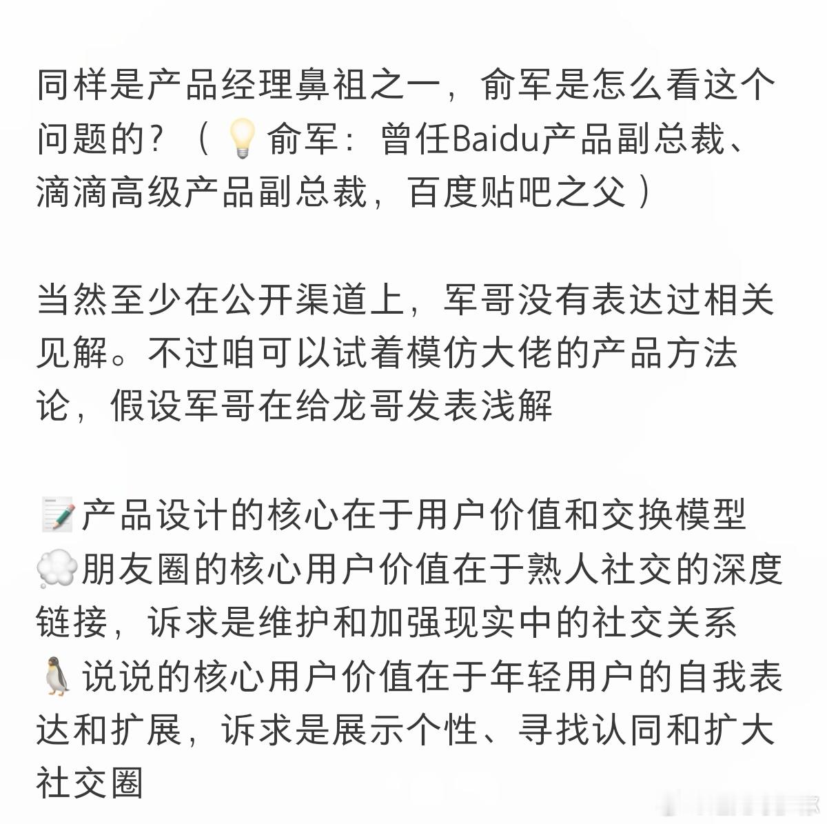 QQ空间vs微信朋友圈朋友圈是出门在外给“家人”发的,说说是人在家中坐,但展示给外界。朋友圈的价值在于熟人社交的深度链接,诉求是维护和加强现实中的社交关系,说说的价值在于年轻用户的自我表达和扩展,诉求是展示个性、寻找认同和扩大社交圈,