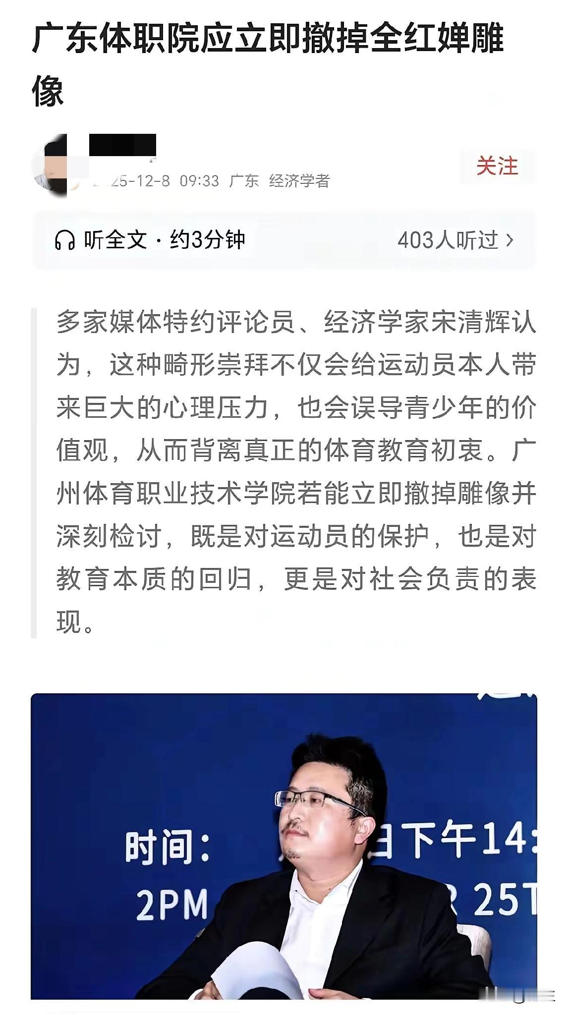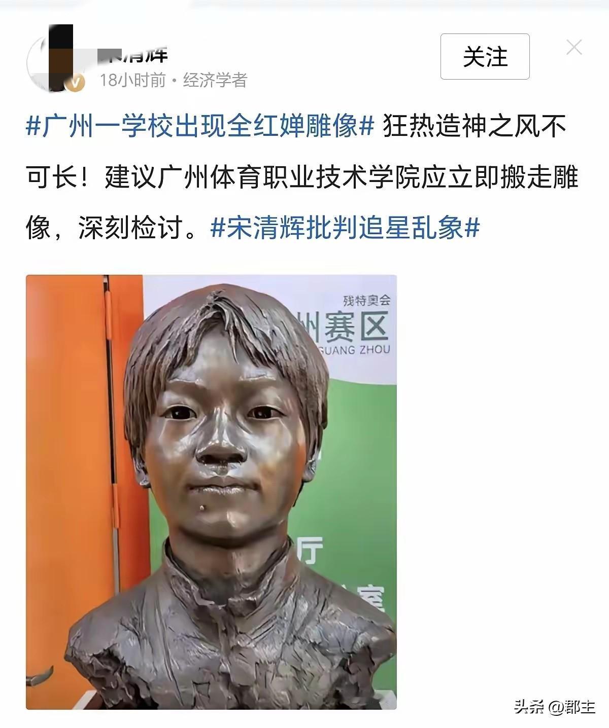这个所谓的经济学家是不是认为应该树立一个日本人雕像才不是畸形崇拜?广东广州体育职业技术学院本身就是一所体育学校,全红婵是一名体育远动员,是一个世界冠军,在体育方面取得的成绩是有目共睹,大家也都认可她,何况她更是一名广东人,体育学校为她树立雕像,以她为榜样怎么了?大家都不反对,就你出来反对,什么意思?外国人这样怎么不说外国人。比如NBA有名的球星,乔丹、科比等,城市都为他们树立雕像,再看看CBA外援马布里,在北京也是有树立雕像,怎么不见去说了?怎么到了自己人这里就是给运动员本人带来巨大的心理压力,误导青少年的价值观,从而背离真正的体育教育初衷呢?我看这个人绝对是有问题的,他的发文都是站在多数人的对立面,而且观点都是有种敌人的感觉。