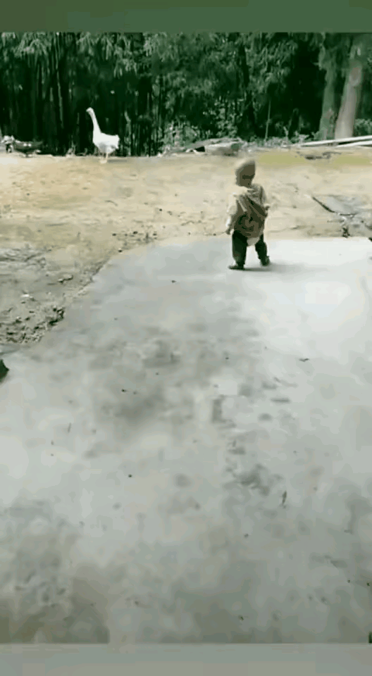 我不信我四条腿跑不过你两条腿。 宝宝刚刚学会了走路,对一切都充满了好奇,今天趁爷爷奶奶不在场,他摇摇晃晃地走到门口尽头看风景。 远处的大白鹅看到宝宝后,攻击欲顿时上脑,它低下头伸直脖子径直朝宝宝冲来。 宝宝一看苗头不对,一屁股坐在地上,使出他练得炉火纯青的爬步功,手脚并用向爷爷奶奶的住房快速爬来。 虽然宝宝的光腚被大白鹅啄了两下,但还是逃脱了大白鹅的追逐成功脱脸。 这一经历也让宝宝明白,大白鹅不好惹,以后一定离它远点。