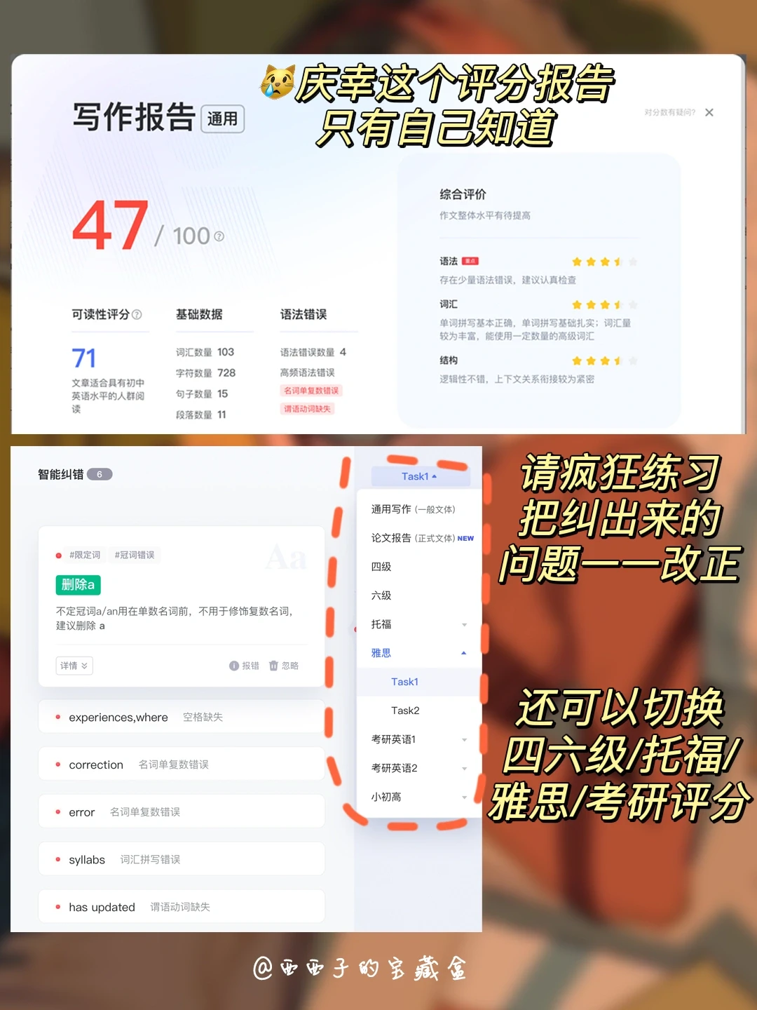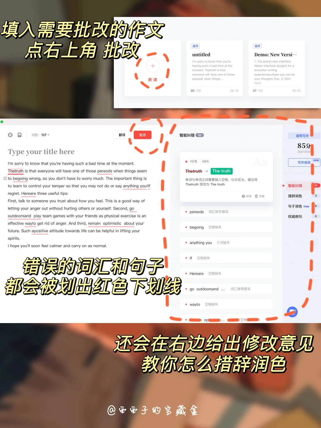 它的AI会自动纠正你的语法错误❎、单词拼错❎、时态错误❎、单复错误等❎,学术级别的句子单词错误,也能一个不落的给你找出来~