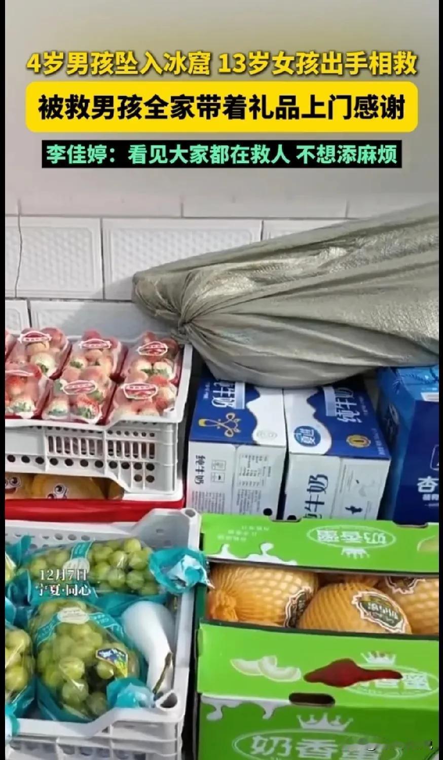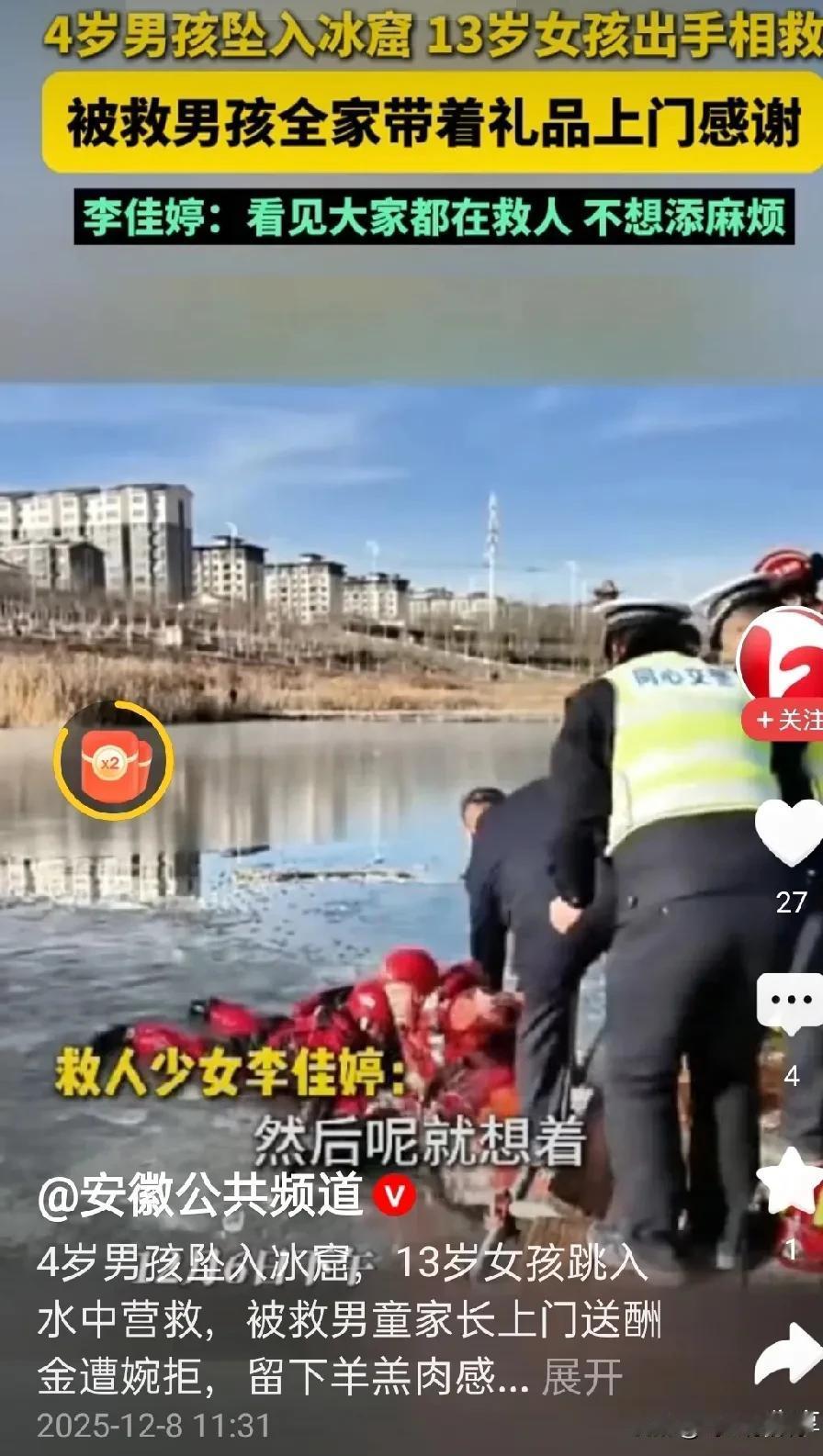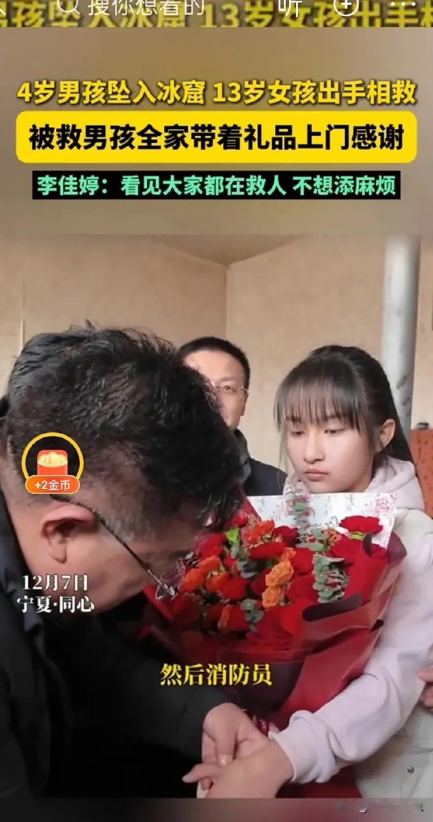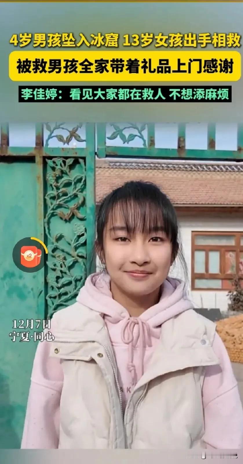 建议被救的四岁男孩和施救者美少女李佳婷姐姐认个亲,让这一美好故事代代相承 13岁女孩李佳婷冰窟救人的感人事迹传遍神州大地,大家纷纷为此点赞 而被救男孩的家人也带着厚礼,到美少女李佳婷家里亲自表达感恩致谢之意 救人一命胜造七级浮屠,李佳婷救了小男孩一命,男孩一家人也是深怀感恩和谢意 在此,多昂贵的礼品也难以表达内心的诚意 虽然没有送上谢金,但是执意留下礼品也是一腔感谢之意 由此可见,两家人都是良善好人 发生这样的事,让两家陌生的人因此而相识, 这就是善缘 如今如能借着这样的机缘和恩情,如果能让小男孩和美少女姐姐李佳婷认个亲,让两个人长久走动起来,让小男孩和美少女姐姐李佳婷的故事变得更加美好而长久,那才是人间佳话 当然 ,这只是一个美好的想法和主意而已 而美好的故事还需要小男孩和美少女李佳婷两家人相处下去才对