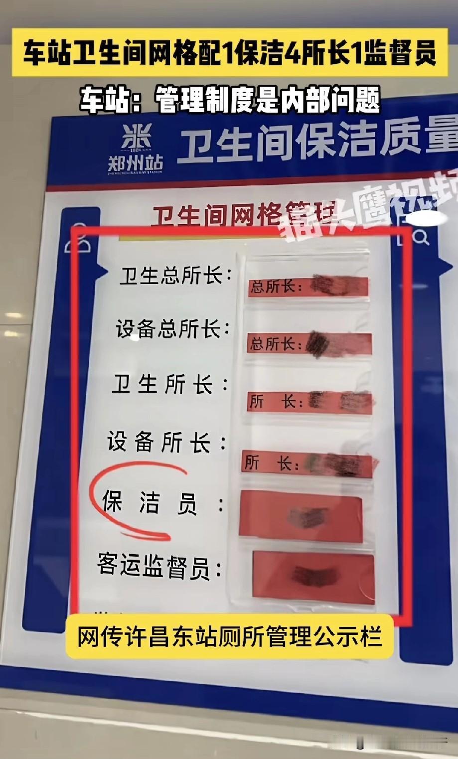 网传许昌东站卫生间网格管理公示栏显示,配置为1名保洁员、4名所长与1名监督员,网友调侃“一个人干活五个人看着”。 对此,许昌东站工作人员回应,许昌东站归郑州站管理,该配置是分区分段的网格化工作制度,属于内部问题;若觉得卫生间卫生差,车站会整改,管理制度不向外透露。