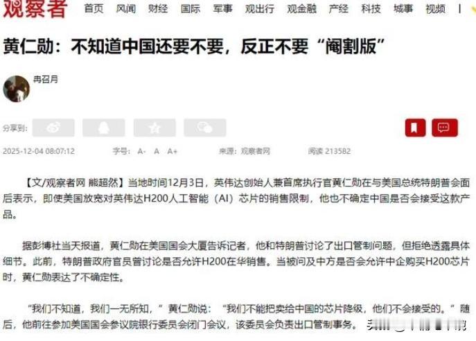 中国已经不需要美国的芯片了!当地时间12月3日,英伟达老板黄仁勋对特朗普直言,中国已经不稀罕美国的H200高端AI芯片了,就算美国放宽限制,中国也不一定要了。 说白了,美国费劲巴力搞的芯片封锁,到头来不仅没卡脖子,反倒把自己的高端芯片逼成了“没人要的烫手山芋”,而中国早就顺着封锁的缝隙,走出了一条自主可控的芯片路。 当地时间12月3日,英伟达创始人黄仁勋和特朗普的一场闭门会面,把这个最扎心的现实摆到了台面上,黄仁勋直言不讳的表态,相当于给美国的芯片出口管制政策判了个“无效刑”。 美国搞芯片出口管制的初衷,明眼人都清楚,就是想通过卡住高端芯片这个关键环节,放慢中国科技进步的脚步,尤其是在AI领域的发展节奏。 从拜登政府到特朗普政府,相关的限制措施一再加码,把包括H200在内的高端AI芯片列为禁售清单的核心品类,以为这样就能掌握科技竞争的主动权。 可他们万万没料到,实际效果完全适得其反,限制越严,中国企业的自主创新动力就越足,原本可能存在的依赖心理,反倒被彻底倒逼成了破局的决心。 黄仁勋的表态可不是空穴来风,而是基于实打实的市场现状。 在此之前,英伟达为了保住中国市场,曾推出过“减配特供版”的H20芯片,好不容易拿到美国政府的出口许可,结果在今年第三季度只创造了约5000万美元的收入,这个数字对于中国庞大的AI芯片市场来说,简直是九牛一毛。 更关键的是,越来越多的中国买家根本不愿为这种“阉割版”芯片买单,这背后正是国产芯片的快速崛起在托底。 就像今年4月发布的中星微“星光智能五号”,已经能单芯片运行DeepSeek 16B大模型,而且采用自主研发架构,基于国产工艺制程,完全不用看美国脸色。 再从行业趋势来看,算力过剩的时代其实已经离我们不远了,现在全球AI行业都在从“拼算力规模”向“提算力效率”转型,不再是单纯追求芯片的参数堆砌。 中国企业在算法优化、算力调度等方面的突破,让现有国产芯片的性能得到了充分释放,很多场景下已经能实现“够用且好用”。 反观美国的H200芯片,就算现在放宽限制,也很难再找到当初的市场定位。 黄仁勋自己都承认,受出口限制影响,英伟达未来两个季度对华芯片销量可能都是零,而中国当前500亿美元规模的AI芯片市场,到2030年可能增长至2000亿美元,美国企业要是一直被挡在门外,这块大蛋糕就只能眼睁睁看着别人分。 其实美国人从始至终都没读懂中国人的韧性,自主创新从来都是中国人刻在骨子里的能力,越封锁,越出成果这句话,在芯片领域再次得到了印证。 这些年,从芯片设计到制造工艺,从材料研发到封装测试,中国的半导体产业链一直在补短板、强弱项,虽然过程艰难,但每一步都走得很扎实。 现在的情况是,我们自己的芯片已经能满足大部分场景的需求,真没必要再花大价钱去买美国的芯片。 美国要是还抱着“封锁就能赢”的幻想继续加码限制,最后这些高端芯片大概率只能烂在仓库里,毕竟除了中国,全球很难再找到这么大的单一市场能消化掉这些产能。 有意思的是,华盛顿内部现在也陷入了两难境地。 黄仁勋这次华盛顿之行,原本是想游说国会放宽限制,甚至已经推动立法者在国防法案中排除了相关限制条款,结果刚有进展,就有两党参议员联名提出新法案,试图彻底禁止向中国出售H200这类先进芯片。 一边是英伟达急于重返中国市场挽救营收,一边是鹰派势力担心“国家安全”不愿松口,而特朗普那句模棱两可的“他懂的”,更凸显了这种矛盾。 但不管美国内部怎么博弈,有一点已经无法改变:中国对美国高端芯片的需求早就不是刚需了。 本文仅为个人看法,不代表任何官方立场,对于黄仁勋的表态,以及中美芯片领域的博弈,你有什么独到的见解?欢迎在评论区留下你的观点。