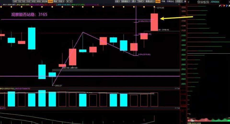 今日市场观察要点昨日受周末消息面提振,市场放量上涨,双创指数表现最为强劲,此走势不少粉丝此前已有所预期,后续核心需关注反弹力度。从技术形态来看,当前走势尚可,但仍需明确,短期暂以反弹行情看待为宜。昨日收评中有粉丝疑问,冲高回落是否意味着反弹结束,就此问题与大家简单探讨。从上证指数短期走势分析,指数已进入第二波反弹阶段,昨日主观判断处于第二波反弹的3浪行情中,后续大概率会经历4浪调整,随后迎来5浪新高,整体走势可参考下图橙色线示意:先调整后再度冲高,目标大致在3950点附近,冲高后将开启回落,时间窗口预计在周三,后续是否还有反弹动能,需结合调整后的具体位置再做判断。今日早盘观察重点简洁明确:优先看分时黄白线走势,黄线居上则行情偏理想;若白线居上且伴随缩量,先警惕回落风险,调整后仍有一次上冲机会。此前11月23日的下周策略中已提及,此处先纠错看反弹,目前反弹已进入后半段,若当前仓位过重,建议适当控制仓位。对于部分投资者认为市场已反转的观点,我的看法不变,仅作观望支持。创业板昨日反弹力度较强,已突破3165点关键点位,后续两天核心观察该点位能否有效站稳。板块层面总结:证券板块已强势两天,考虑到上方套牢盘压力较大,主观建议以观察为主,暂不急于介入。作品声明:内容仅为个人观点,仅供参考,不构成任何投资建议。