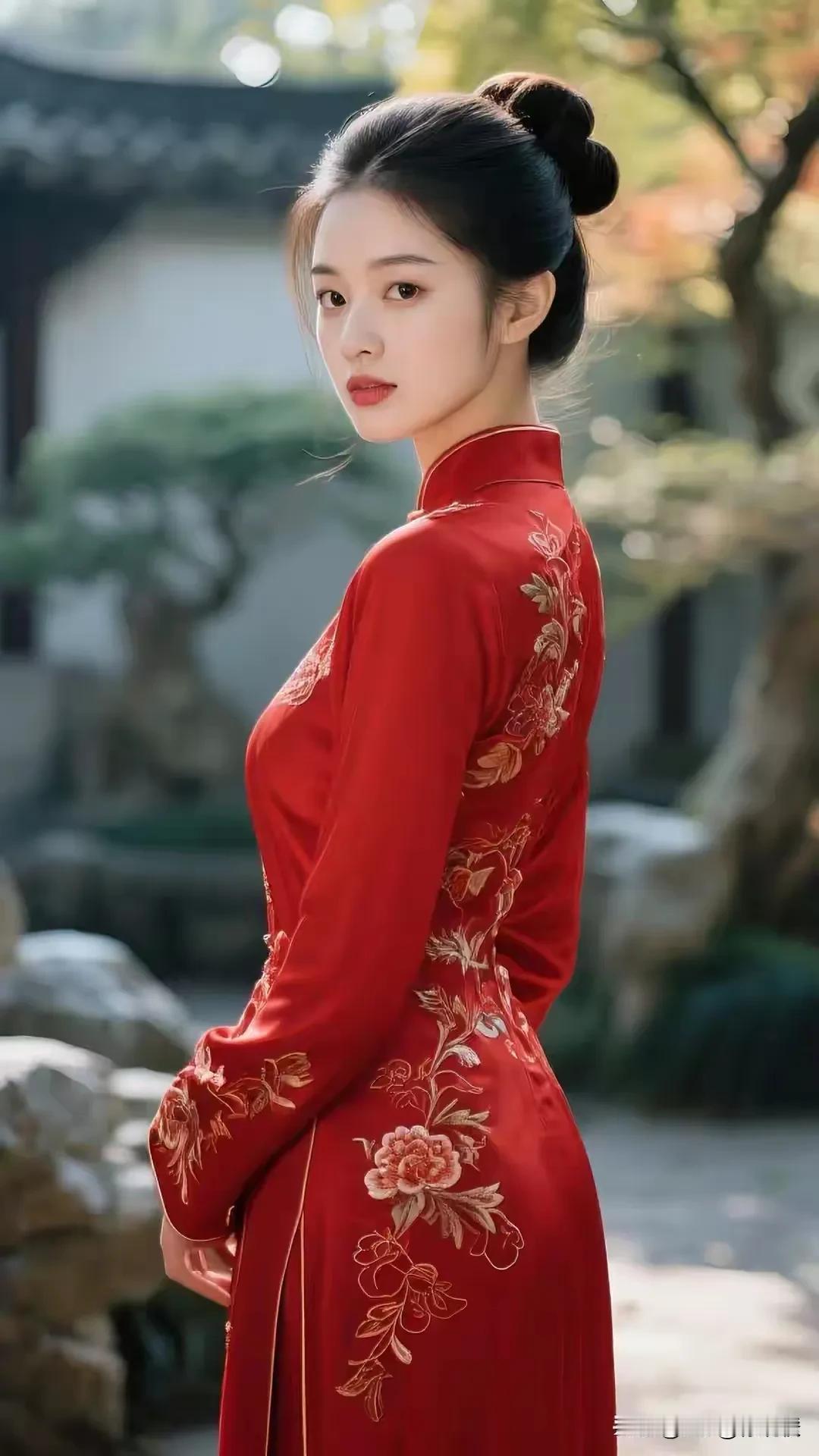 中国红,红旗袍 纤腰楚楚随风摆, 丽影翩翩入梦来。 杏眼含情波潋滟, 天生丽质胜牡丹。