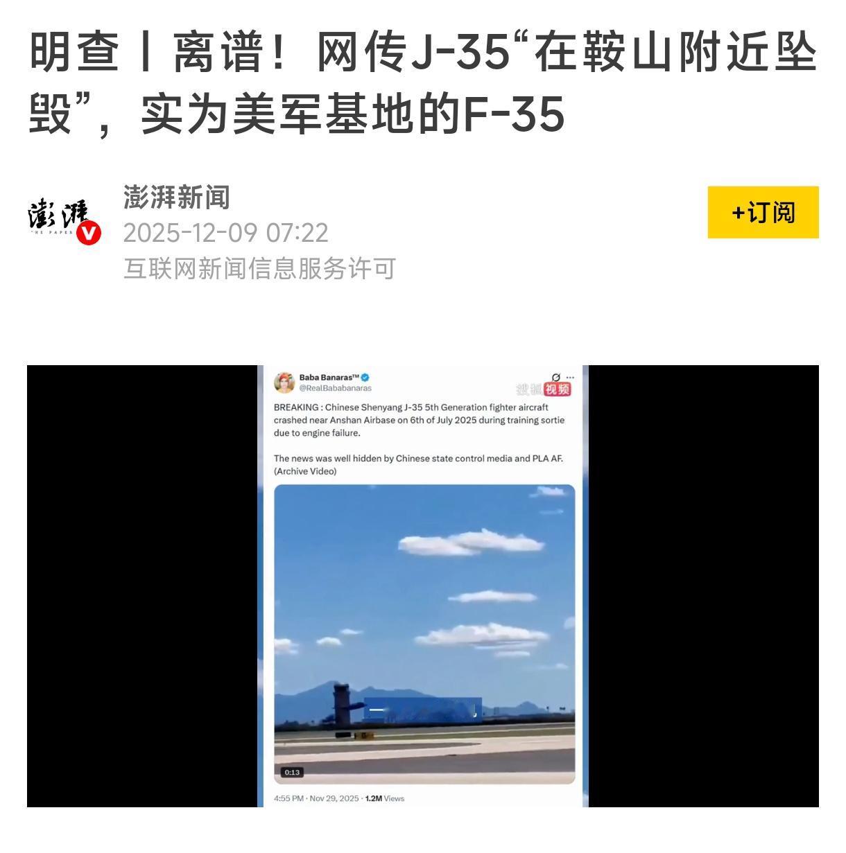 果然国际斗争手段频出,嗯,不择手段。 为了抹黑中国军工,最近外网疯传歼35坠毁,结果被扒出来造假,反而影响他们自己的“名誉”。 网传视频中的飞机并非J-35,而是F-35。地理定位核查结果显示,画面拍摄地点也并非鞍山,而是美国的戴维斯蒙森空军基地。 这事,可能是印度人,他们有动机,因为歼35可能出口。 当然,也可能是日本,他们最怕中国强大,自嗨以掩耳盗铃。 也有可能是美国,搞心理战。