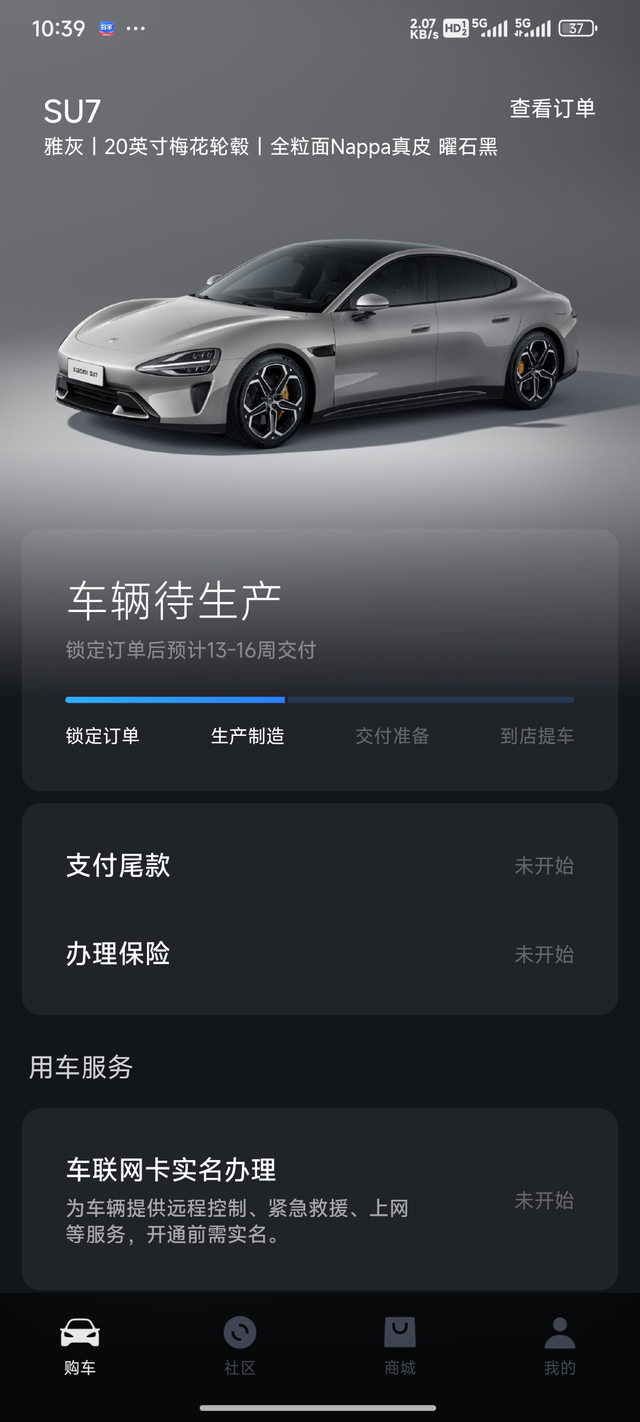 已定要等三个月有没有同配置的 内饰颜色纠结了挺久,说下我选黑色的理由 1pass白色是因为太容易脏了,试驾车的白色内饰已经惨不忍睹了,还有就是小米的内饰风格偏运动不够精致,白色内饰更突显细节的不足 2pass红色因为小米的红色太亮了,不像保时捷的波尔多红,我觉得有点用力过猛 3不选紫色是因为毕竟小众色系,和雅灰外观有点不协调,不百搭,更适合紫色外观 4黑色意外的好看,搭配红色缝线也不老气,耐脏并且能掩盖内饰质感不足的问题,和那个运动的方向盘也更搭