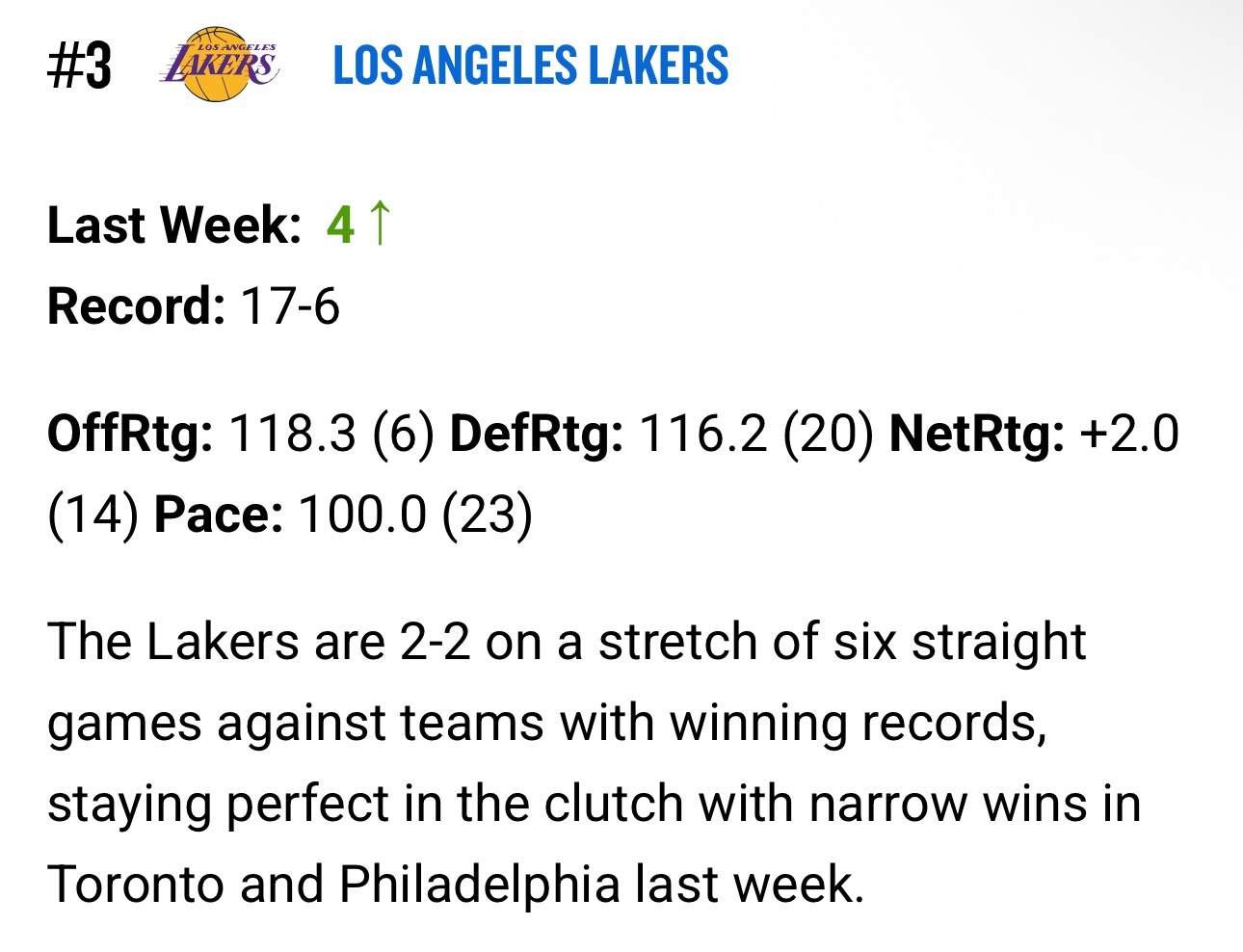 官网更新球队实力榜,湖人从第四位升到第三位!