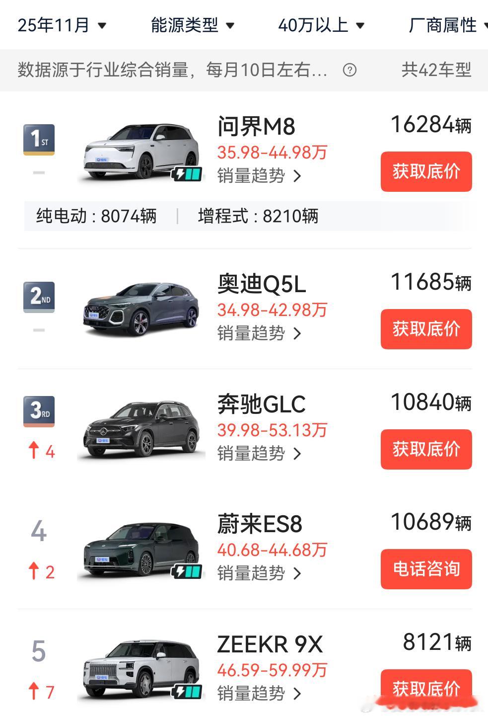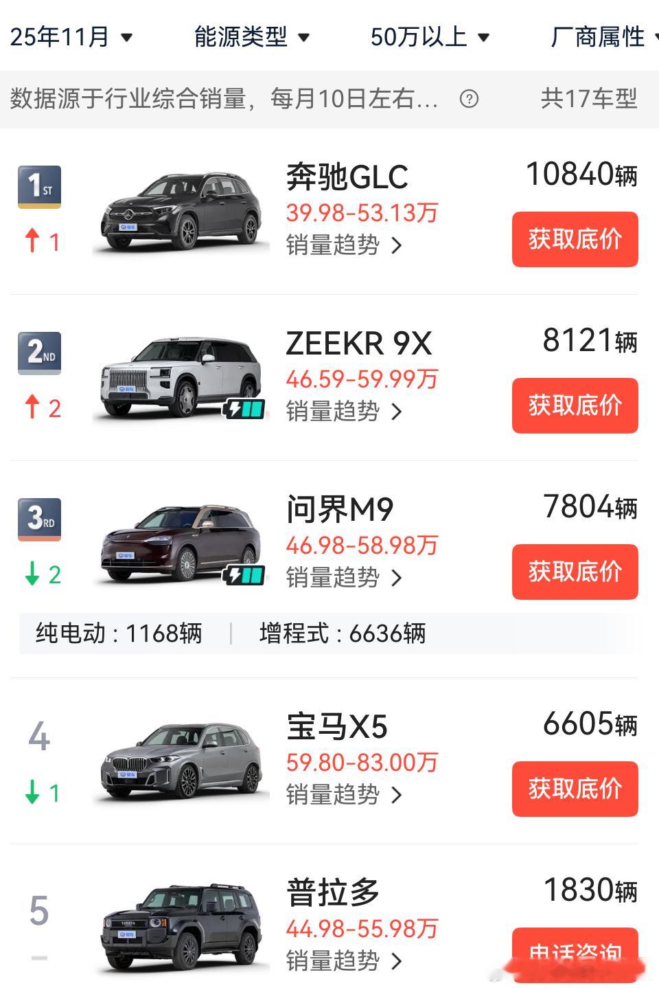 11月份35万以上问界M7增量非常明显相较于上个月多了接近1万。问界M8持续保持了40万以上的冠军。问界M9相较于上个月少了206台,GLC,9X,和X5都有增长,问界M9确实该进一步提升一下竞争力了。问界问界m9