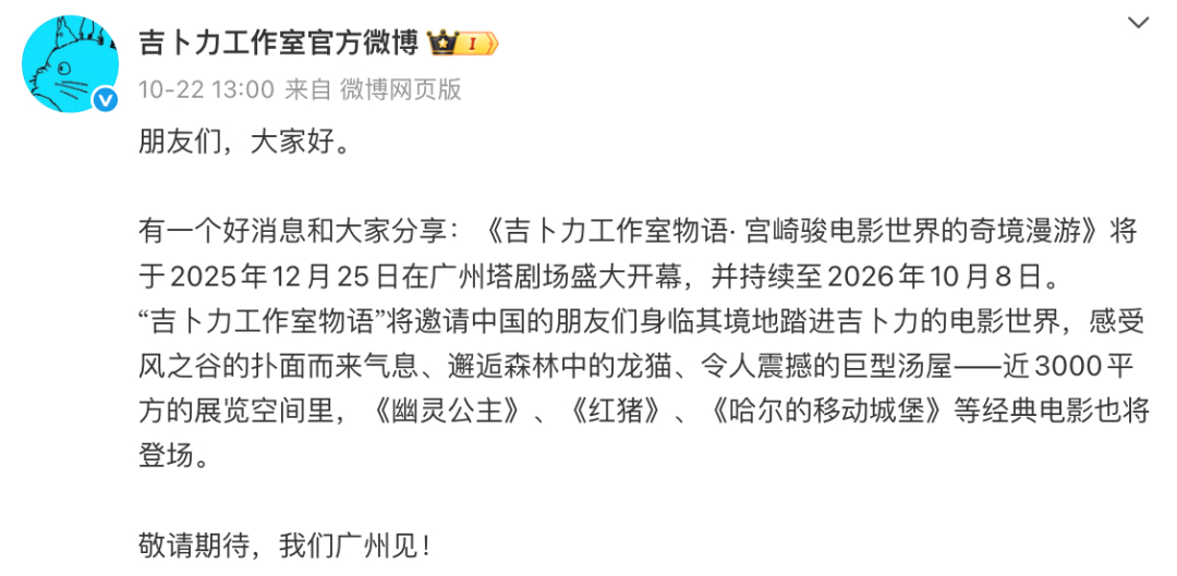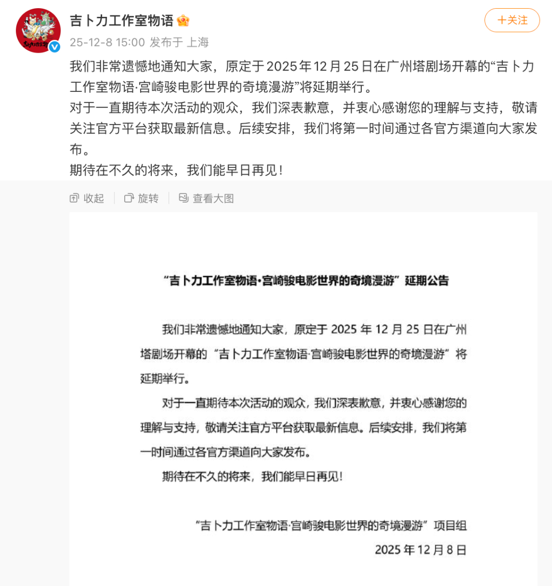 #吉卜力工作室物语致歉#【吉卜力工作室物语:深表歉意】#吉卜力在广州塔剧场的艺术展延期了#昨天(12月8日)下午,吉卜力工作室物语展览的官方微博 发布延期公告称,原定于2025年12月25日在广州塔剧场开幕的“吉卜力工作室物语·宫崎骏电影世界的奇境漫游”将延期举行。后续安排,将再通过各官方渠道发布。 全文如下:我们非常遗憾地通知大家,原定于2025年12月25日在广州塔剧场开幕的“吉卜力工作室物语·宫崎骏电影世界的奇境漫游”将延期举行。对于一直期待本次活动的观众,我们深表歉意,并衷心感谢您的理解与支持,敬请关注官方平台获取最新信息。后续安排,我们将第一时间通过各官方渠道向大家发布。 期待在不久的将来,我们能早日再见!随后,吉卜力工作室官方微博转发了该条微博表示“感谢朋友们的支持与包容,期待与大家在不久的将来相见。”10月22日,发消息称,《吉卜力工作室物语· 宫崎骏电影世界的奇境漫游》将于2025年12月25日在广州塔剧场盛大开幕,并持续至2026年10月8日。“吉卜力工作室物语”将邀请中国的朋友们身临其境地踏进吉卜力的电影世界,感受风之谷的扑面而来气息、邂逅森林中的龙猫、令人震撼的巨型汤屋——近3000平方的展览空间里,《幽灵公主》、《红猪》、《哈尔的移动城堡》等经典电影也将登场。