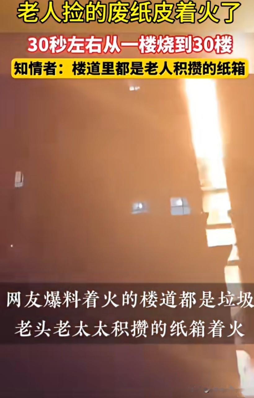 一老人存了点纸壳子着了,路人说三十秒窜了一整栋楼,太危险了。 我隔壁收废品的,他家从一楼到三楼直至门口全是纸皮塑料,只有客厅有一条十厘米的走道,每年过年都要帮他救火,不救就烧到我家了,因为他们一家子都搬出去住了,政府叫他整改,无果。 老头老太太捡垃圾不是优良传统么,勤俭持家滴,应该支持,闯祸了也没事,赔就完了,自己这辈子赔不完儿女赔,孙子赔,反正有赔完那一天,