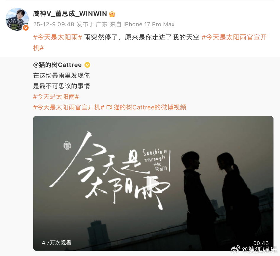 杨超越、董思成新剧《今天是太阳雨》发布人物海报正式官宣开机!穿过雨季...