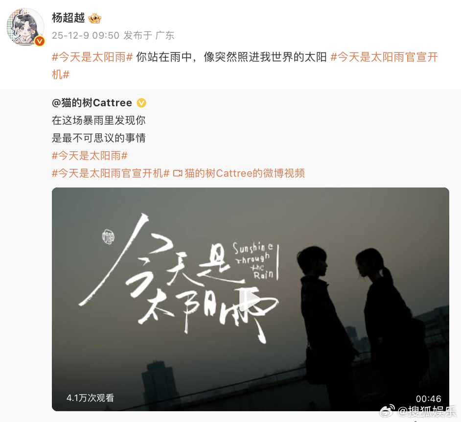 杨超越、董思成新剧《今天是太阳雨》发布人物海报正式官宣开机!穿过雨季,一起期待郑雨和陈砚周的故事☂️今天是太阳雨官宣开机