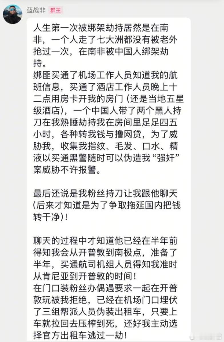 知名博主、千万大V蓝战非在非洲开普敦遭遇绑架劫持?!劫匪之一自称是他粉丝。蓝战