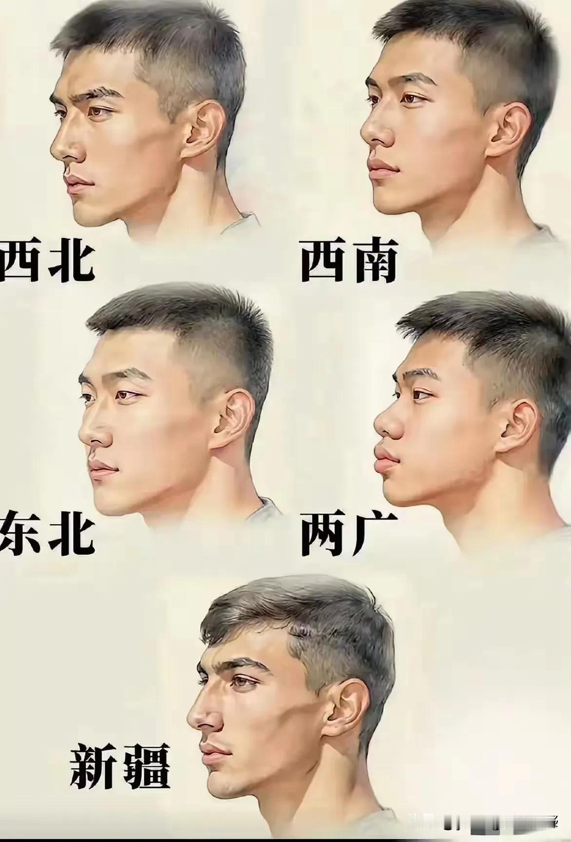 AI生成的国内各个区域人们的五官特征图。西北人五官显得英朗,东北人英伦,西南人显得秀气,这两广人……啥意思?向前凸起的嘴巴吗?两广人就是这样的特征??