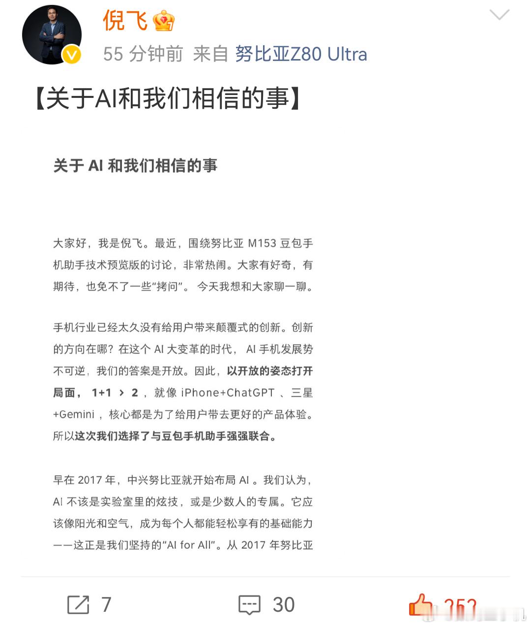 相信大家也都关注到了努比亚这次的大动作,努比亚总裁倪飞回应豆包手机 努比亚M153豆包手机直接搭载了豆包助手的技术预览版。这波操作很“努比亚”,就是抱着“AI创行者”那种开放的劲儿,不自己硬扛,而是找行业里的高手组队。强强联合,目标就一个:搞出那种“1+1>2”的颠覆体验,让咱们用户能早点用上更爽的产品,路子选得挺明白。我觉得开放生态才是王道,是整个AI行业的未来趋势,正如飞总所说,主动破局实践才能共同进步!并且这个努比豆手机很有可能成为中国AI行业发展史当中的一个里程碑式的事件。