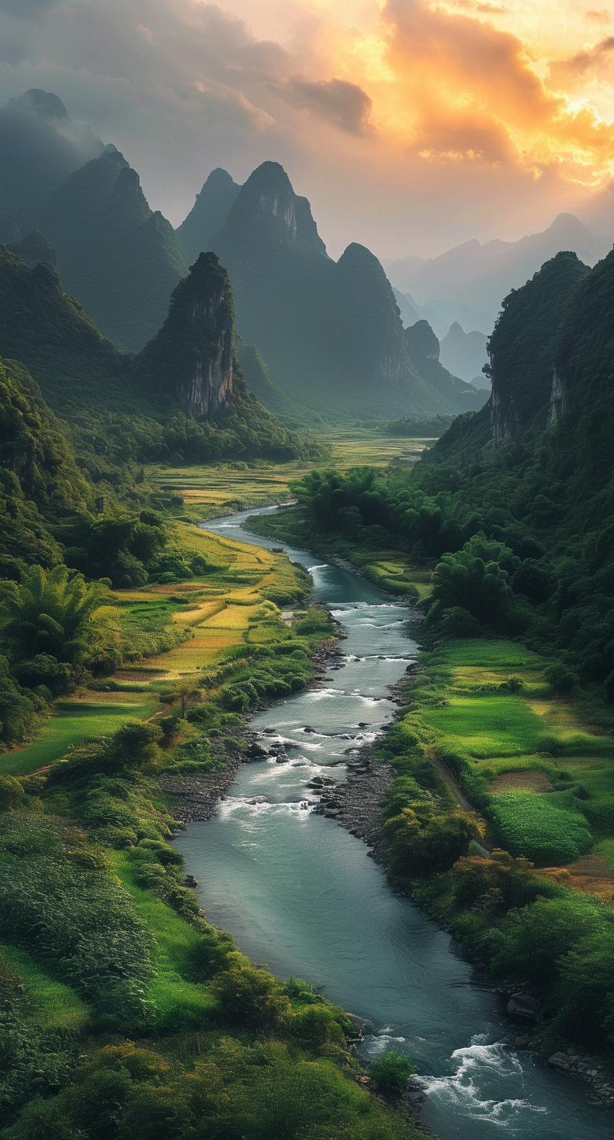 在夕阳的余晖中,远山被染成金色,河流静静流淌,倒映着天空的橙红色。微风拂过,带来一阵清新的气息。这一刻,心也变得格外宁静。