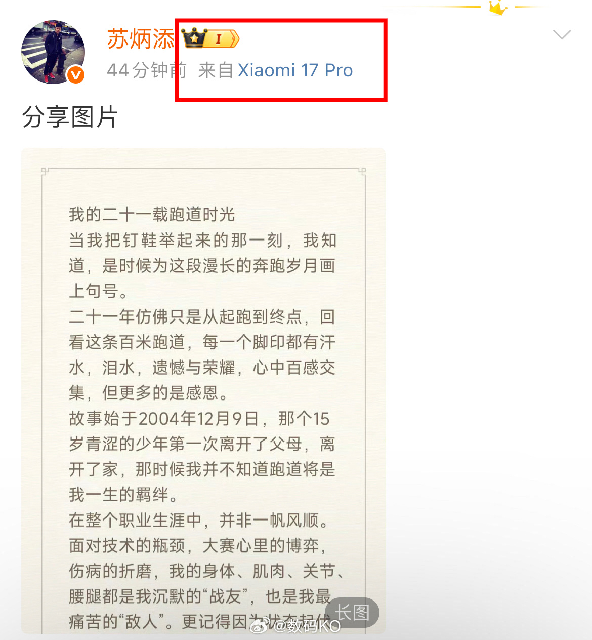 苏炳添退役苏炳添退役,没想到还在一直使用小米17 pro