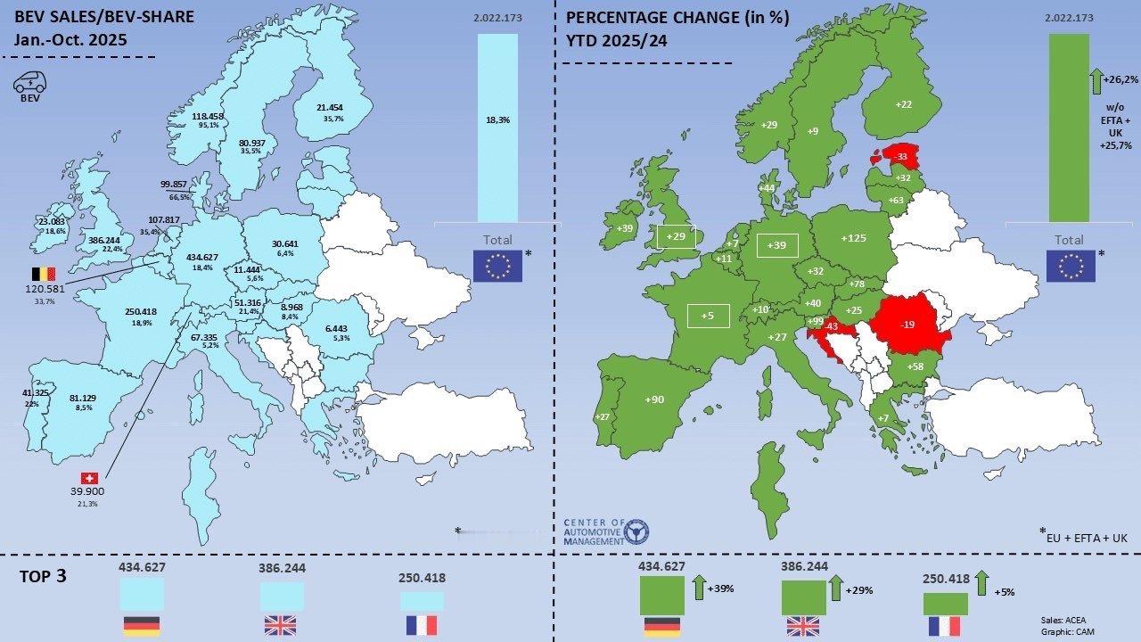 欧洲电动车到底卖得怎么样?答案比你想象得更夸张。如果只看今年欧洲传统车市那 1.9% 的温吞增长,你可能会以为行业在原地踏步。但把新能源单拎出来,画风完全不一样。2025 年前 10 个月,欧洲纯电动 BEV 已经注册了 202 万辆,同比直接冲上 +26.2%,在所有新车里占到 18.3%,比去年又抬高了一个台阶。你看这张图更直观:北欧依旧是“电动车宇宙中心”,挪威几乎 95% 都是纯电,丹麦、瑞典、荷兰、比利时都稳定在 30–60% 之间。西欧几大主力市场里,英国 22%,法国 19%,德国虽然补贴退坡,但依旧有 18% 的份额。增长速度也很有意思:波兰、西班牙、意大利这些“慢热区”依旧偏低,但今年几乎全线在往上走。整个欧盟+英国+EFTA 区域,几乎地图上一片绿色,都是正增长。真正顶住欧洲 EV 市场体量的,其实还是德国和英国,两国合计已经卖出超过 80 万辆纯电,占了欧洲 BEV 的绝对大头,而且今年依旧维持着两位数增长。大v聊车电车出海欧洲电动车
