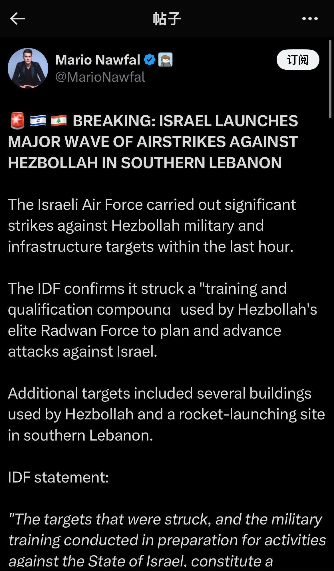 突发:以色列对黎巴嫩南部真主党发动大规模空袭 在过去一小时内,以色列空军对真主党的军事和基础设施目标进行了大规模打击。 以色列国防军证实,他们袭击了真主党精锐部队拉德万部队用于策划和推进对以色列袭击的“训练和资格认证基地”。 其他目标包括真主党使用的几栋建筑物和黎巴嫩南部的一个火箭发射场。 以色列国防军声明: “袭击目标以及为针对以色列国的活动而进行的军事训练,违反了以色列和黎巴嫩之间的谅解,并对以色列国构成威胁。” 拉德万部队是真主党最强大的部队,负责跨境行动,被认为是任何地面入侵以色列北部行动的先锋。 资料来源:以色列国防军,《以色列时报》