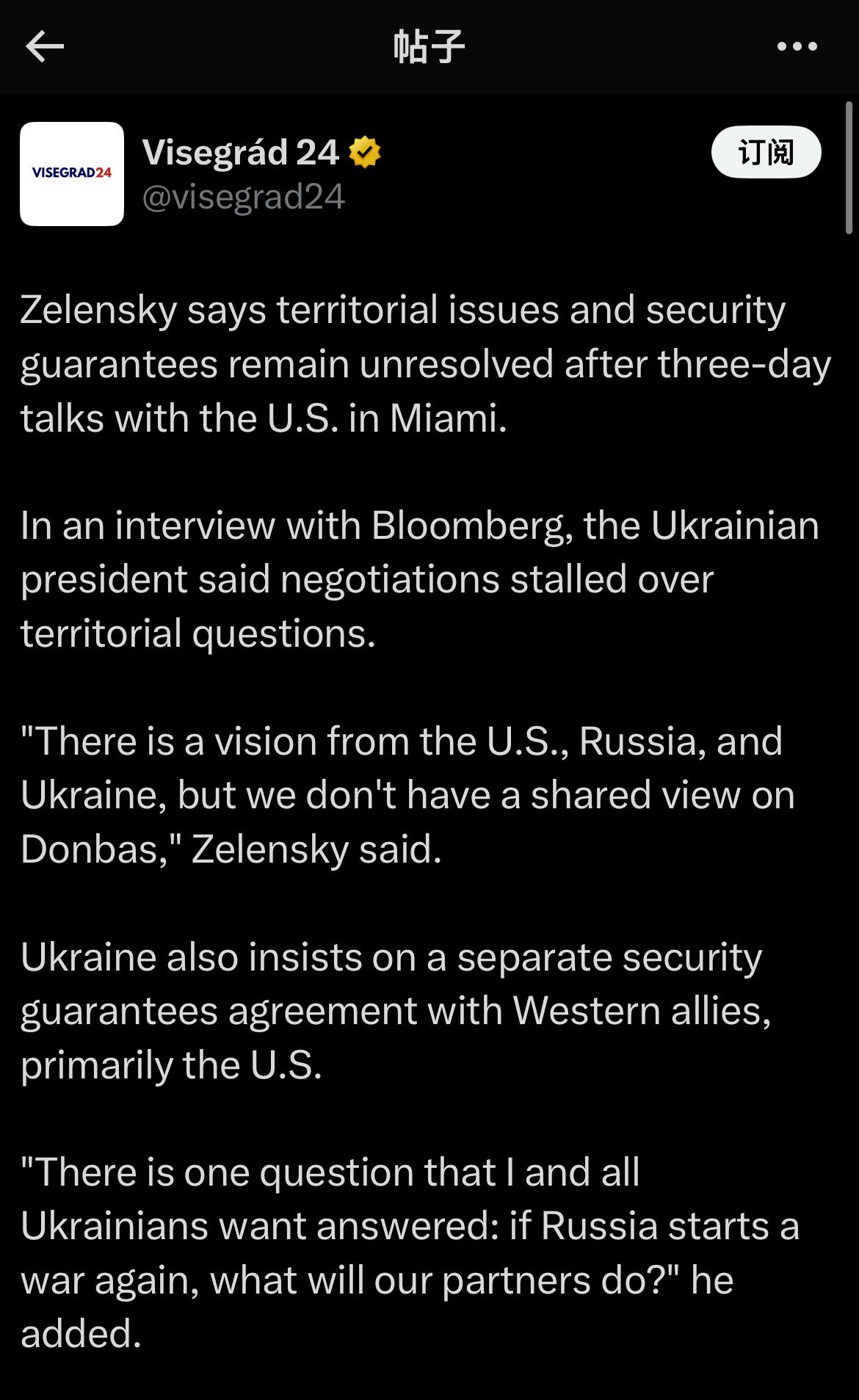 泽连斯基表示,在迈阿密与美国进行了三天会谈后,领土问题和安全保障问题仍未得到解决。 乌克兰总统在接受彭博社采访时表示,谈判因领土问题陷入僵局。 泽连斯基说:“美国、俄罗斯和乌克兰有一个共同的愿景,但我们在顿巴斯问题上没有共同的看法。” 乌克兰还坚持与西方盟友,主要是美国,签订单独的安全保障协议。 他补充说:“我和所有乌克兰人都想知道一个问题的答案:如果俄罗斯再次发动战争,我们的伙伴会怎么做?”