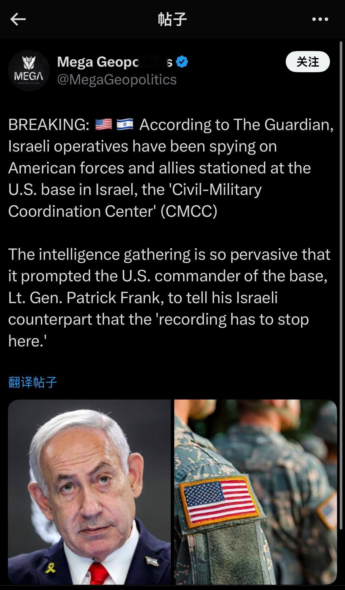 突发新闻: 据《卫报》报道,以色列特工一直在监视驻扎在以色列美军基地“军民协调中心”(CMCC)的美军及其盟友。 情报收集工作如此普遍,以至于该基地的美国指挥官帕特里克·弗兰克中将不得不告诉他的以色列同行,“记录必须到此为止”。